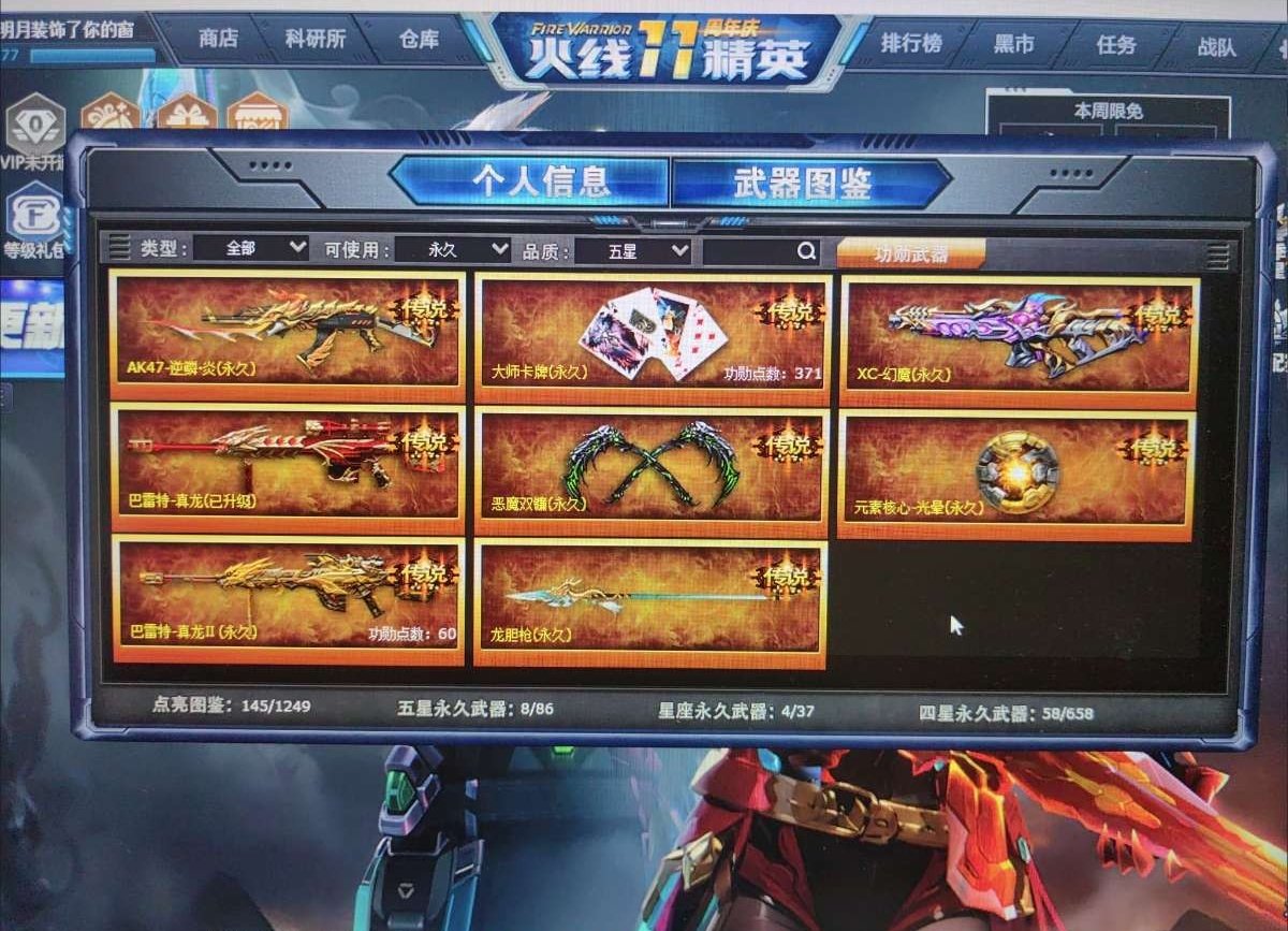 亮点: 至尊五星帝王充值四万+ 生化 爆破/幽灵 挑战都可以 四镰刀 四初恋 四碎星 不算二次升级五星 有二十几把 还有几把五星没肝 火雷快出了 多套装 还有一些没拍到神话暂无可刀