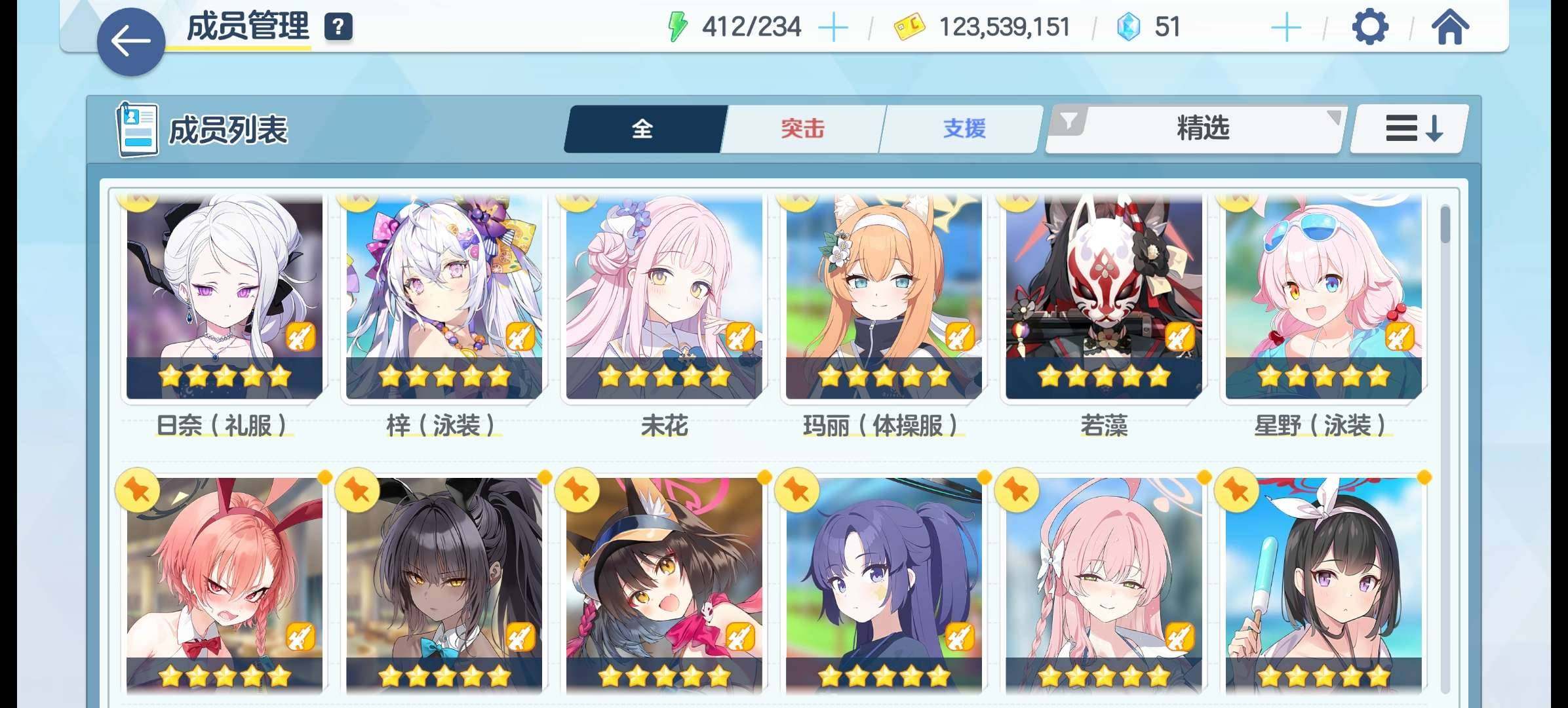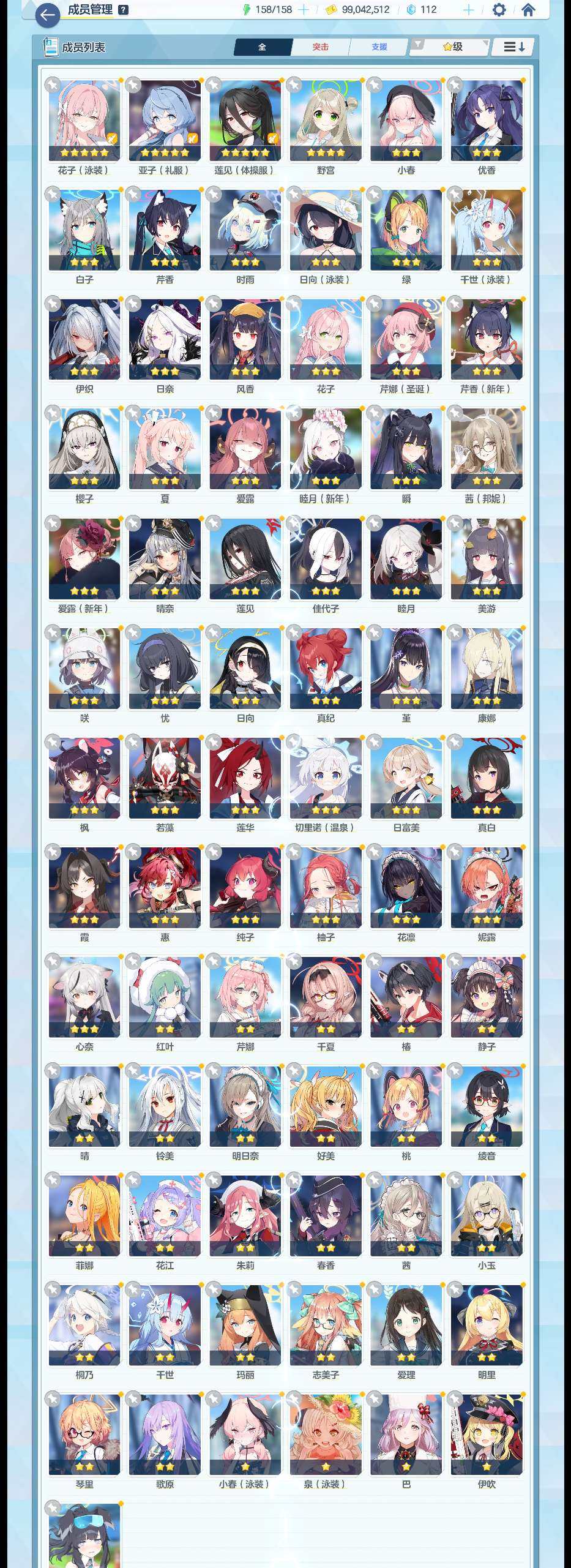 亮点: 日服,后续在复刻的限定里多补几个常驻人权红薯、忧、春佳等玩得就很舒服了,fes都齐了,钻也非常足够,水星野、未花专2,礼服日奈专3,其余推图进度、剧情母猪石、资源就的都在图里了,桃信100多条,大人卡片未使用,还是算比较完美的半初始,仅绑自用邮箱,接受合理议价