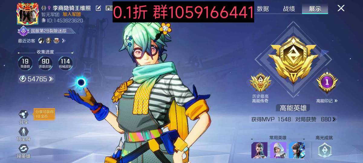 实名: 可修改 亮点: 全英雄,便宜送了,特别值,115英雄皮肤,140枪械皮肤,能爆值三万九千二百五十八,欧皇账号,契约五十多级了有三个传说飞行器,超帅尾焰,一个传说复仇之火,四把传说枪,风暴模式还有一百三十多万星元,有两个宠物皮肤,获得VIP:958次。灵猫、光速小子、治愈之心,电磁夜曲等熟练度都打到最高了,首充了,充了大几千,QQ飞车连体号,A车不多不少