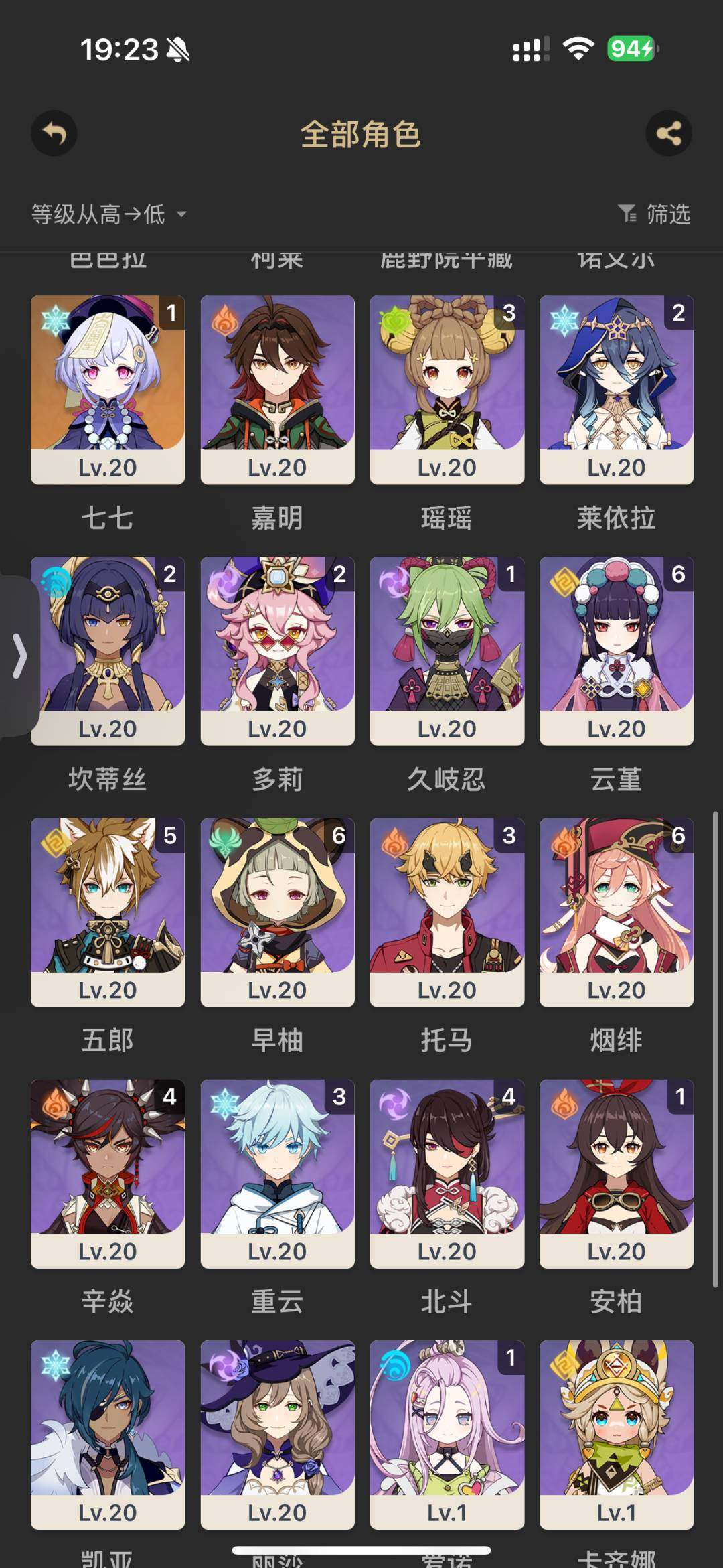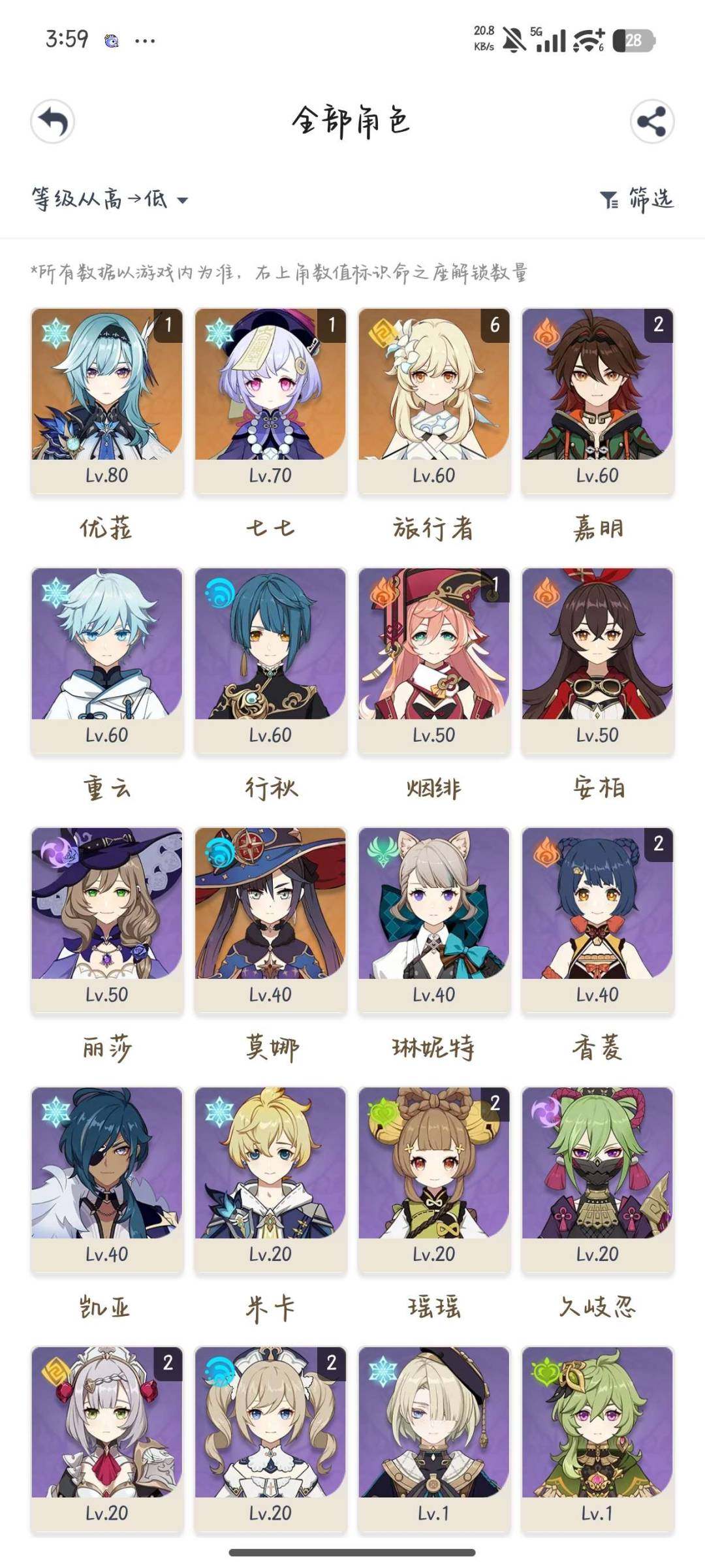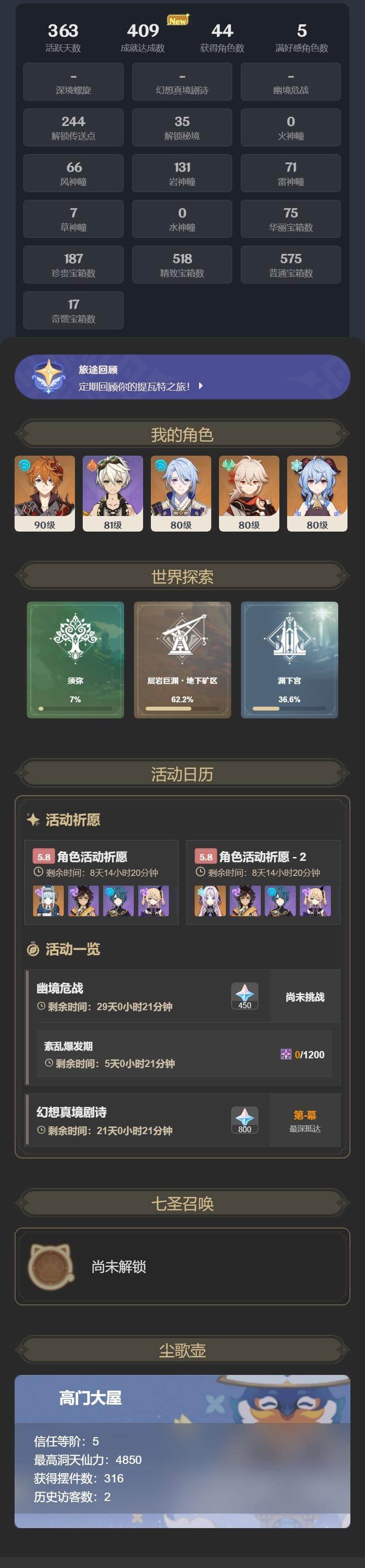 拥有金色角色: 爱可菲,玛薇卡,克洛琳德,芙宁娜,枫原万叶,胡桃,迪希雅,提纳里,刻晴,琴,七七 亮点: 56级