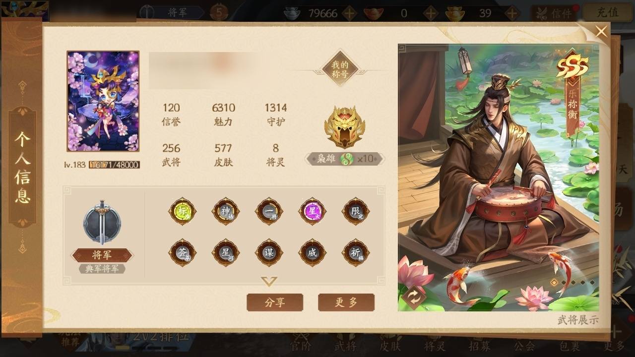 【14】官阶:卫将军;VIP等级:7;武将数量:0;皮肤数量:0;传说皮肤数量:0;动态皮肤数量:0;神将:17;魏国史诗武将:72;蜀国史诗武将:52;吴国史诗武将:56;群史诗武将:112