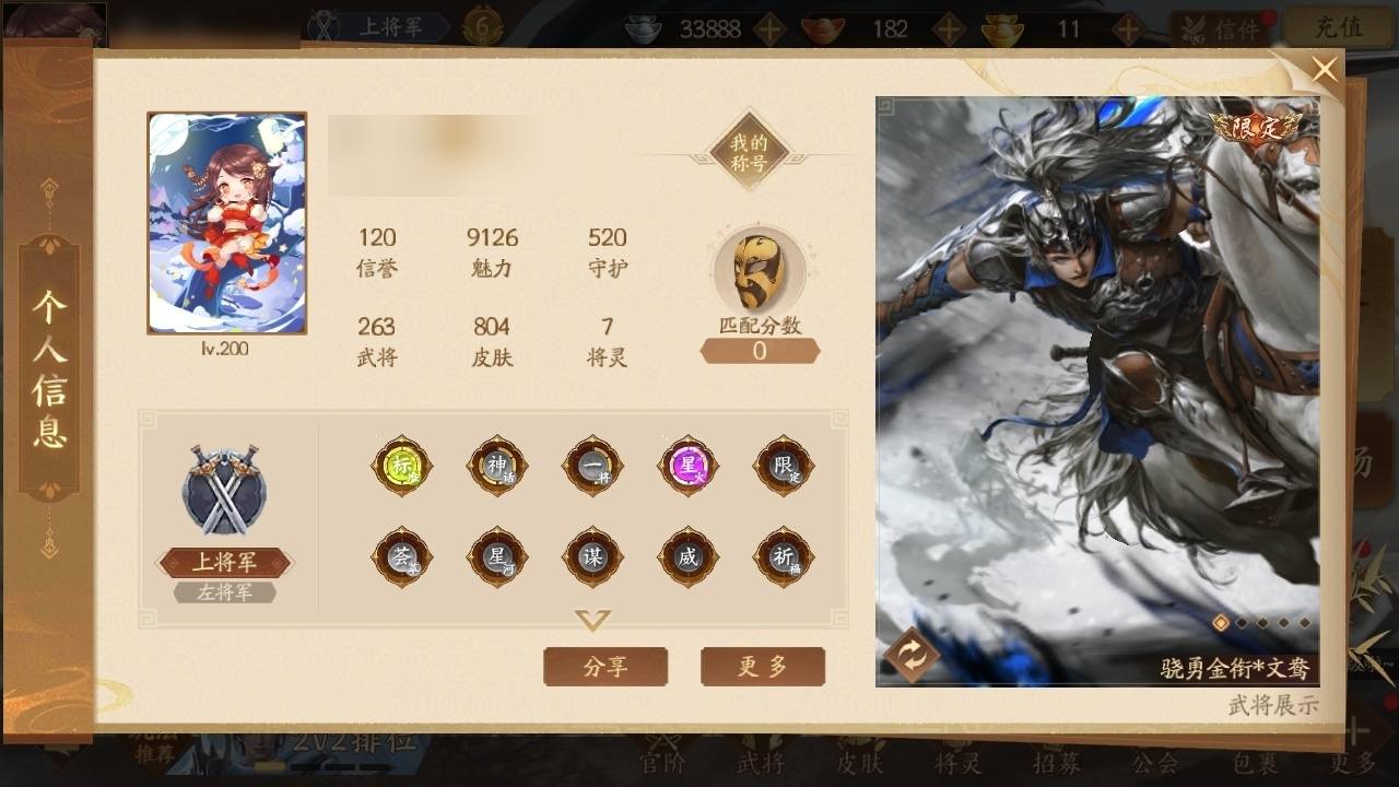 【20】官阶:国护军;VIP等级:7;武将数量:0;皮肤数量:0;传说皮肤数量:0;动态皮肤数量:0;神将:14;魏国史诗武将:17;蜀国史诗武将:8;吴国史诗武将:11;群史诗武将:19