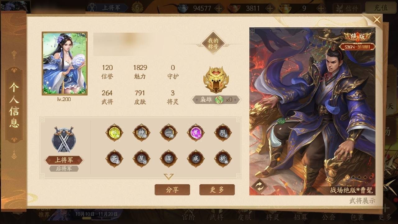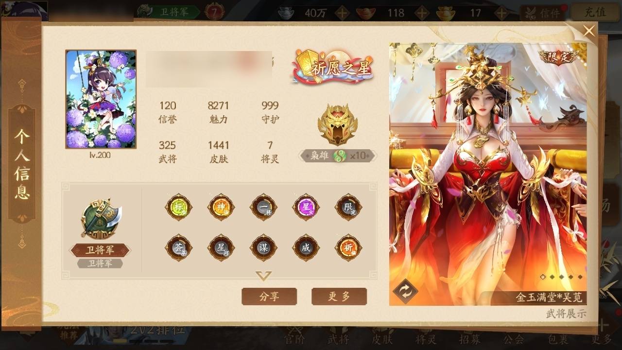【17】官阶:国护军;VIP等级:7;武将数量:0;皮肤数量:0;传说皮肤数量:0;动态皮肤数量:0;神将:12;魏国史诗武将:52;蜀国史诗武将:43;吴国史诗武将:44;群史诗武将:82