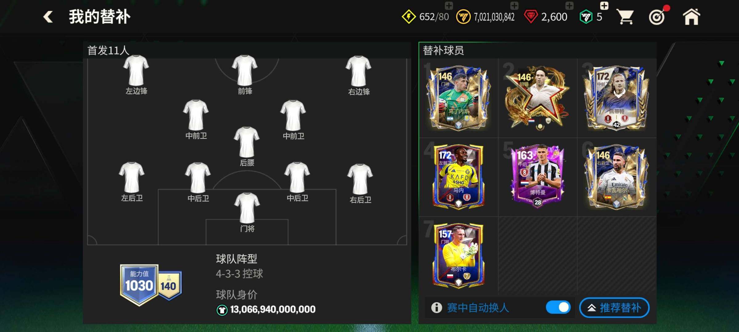 卖家说:阵型424前场:左边锋145卡王莱奥 客串(左边锋)144卡王加克波 146龙罗 右边锋 145奥维兰 中场:145卡王若昂特谢拉 卡王145麦克托米奈 后场:144卡王坎塞洛 145卡王 斯塔姆 145卡王 斯塔姆 145 可委屈萨利巴 门将141卡王 范德萨