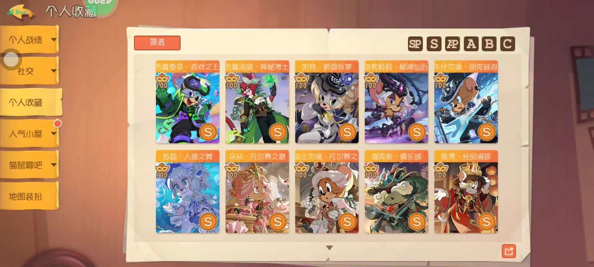 卖家说:1sp 2sss 27s 8ap 两万一收藏值 还有一金羽毛 泰菲莉莉剑菲小情号 九游服的 铂金会员还有一百多天 知识卡全满级 六次鼠皇一次猫皇 宗师鼠20猫4 除了金羽毛角色,全角色都有 大刀勿扰 详情看图