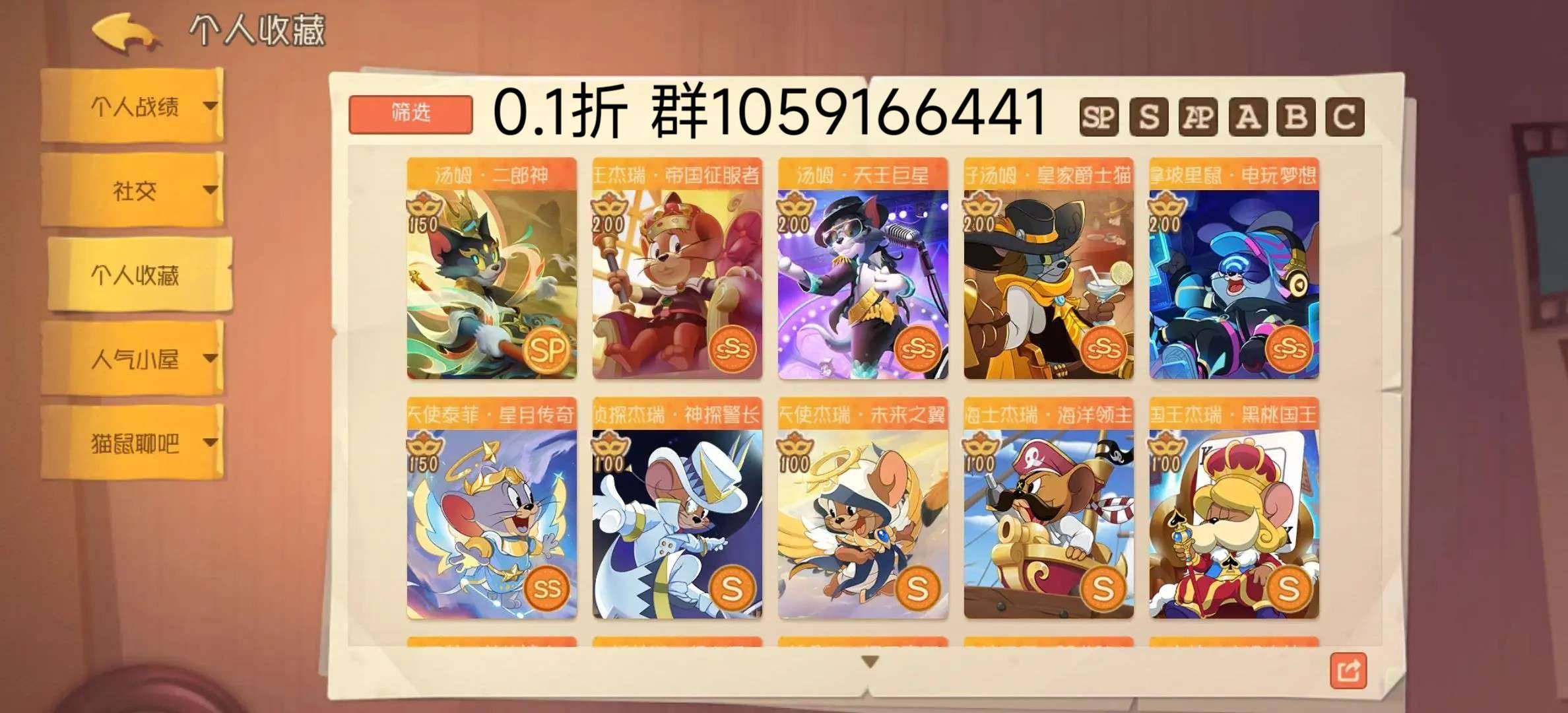 账号类型: 手机账号 换绑冷却: 无冷却 网易支付状态: 未注册 亮点: 14鼠皇15猫皇 2个sssp 3个sp 24个sss 2个2s 27个s 28个ap 火箭机器鼠各三个(机器鼠一个改满,火箭一个半改满)此赛季货架升级版已买,可微刀哈