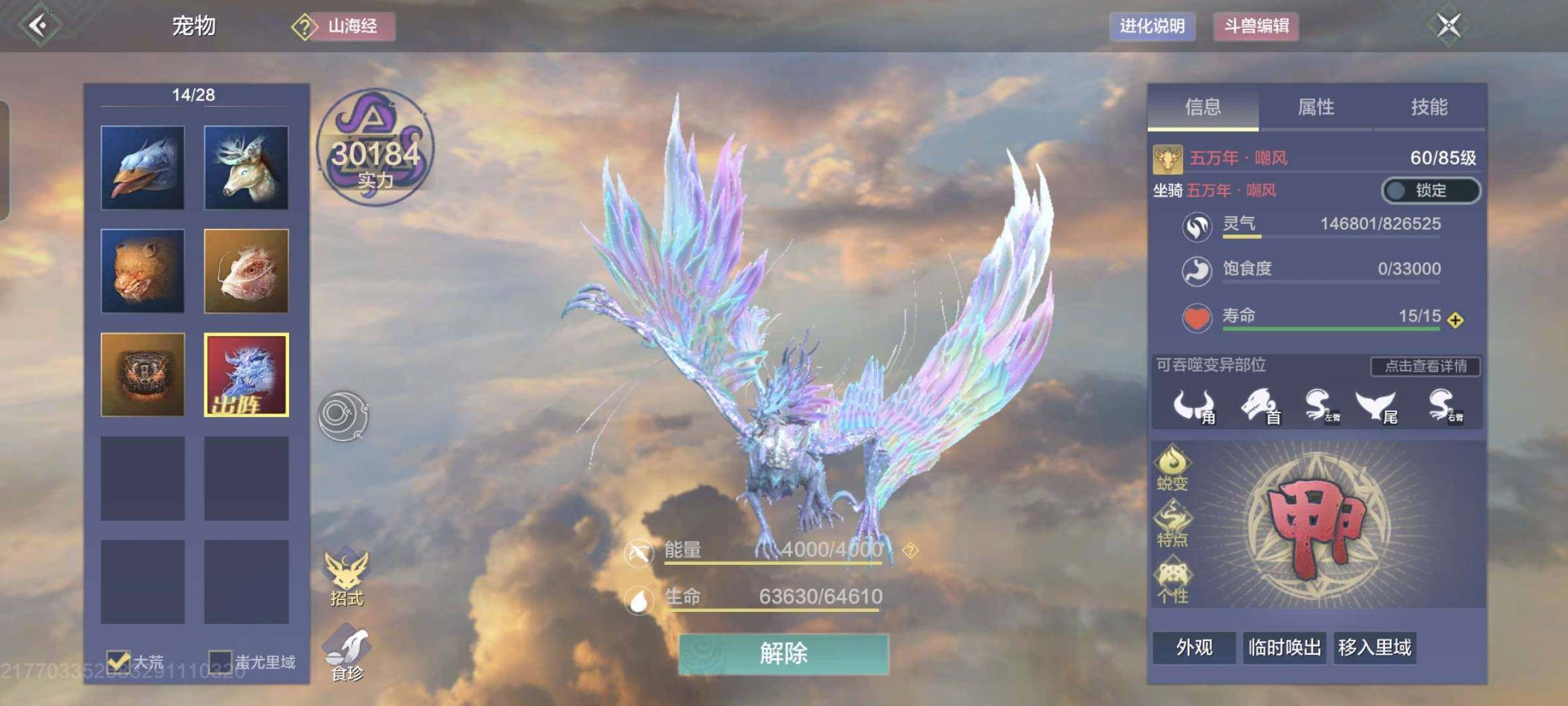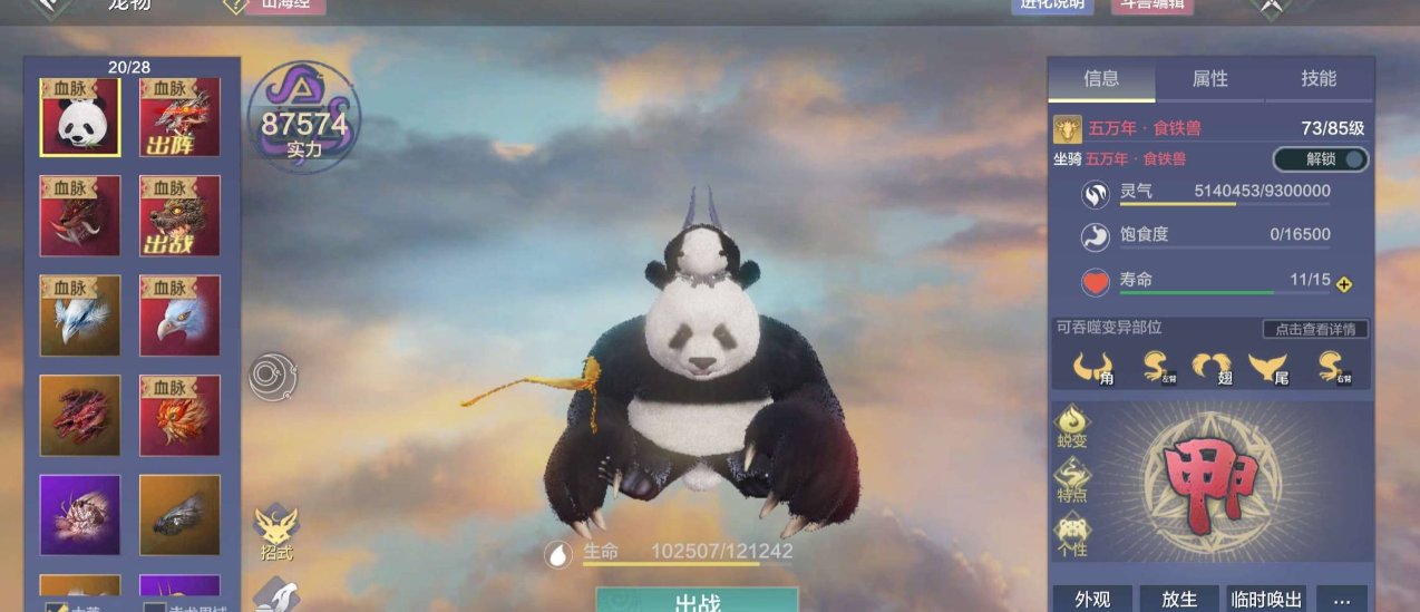 卖家说:出妄想山海账号,85级,山海经系列,属性加成高,翅膀时装帅,资源多,养成好,直接上手玩。账号个人原因转让,支持小刀,三个神兽全部血蛋喂满,号上还有超级稀有的狮鹫和九头蛇和一个云台
