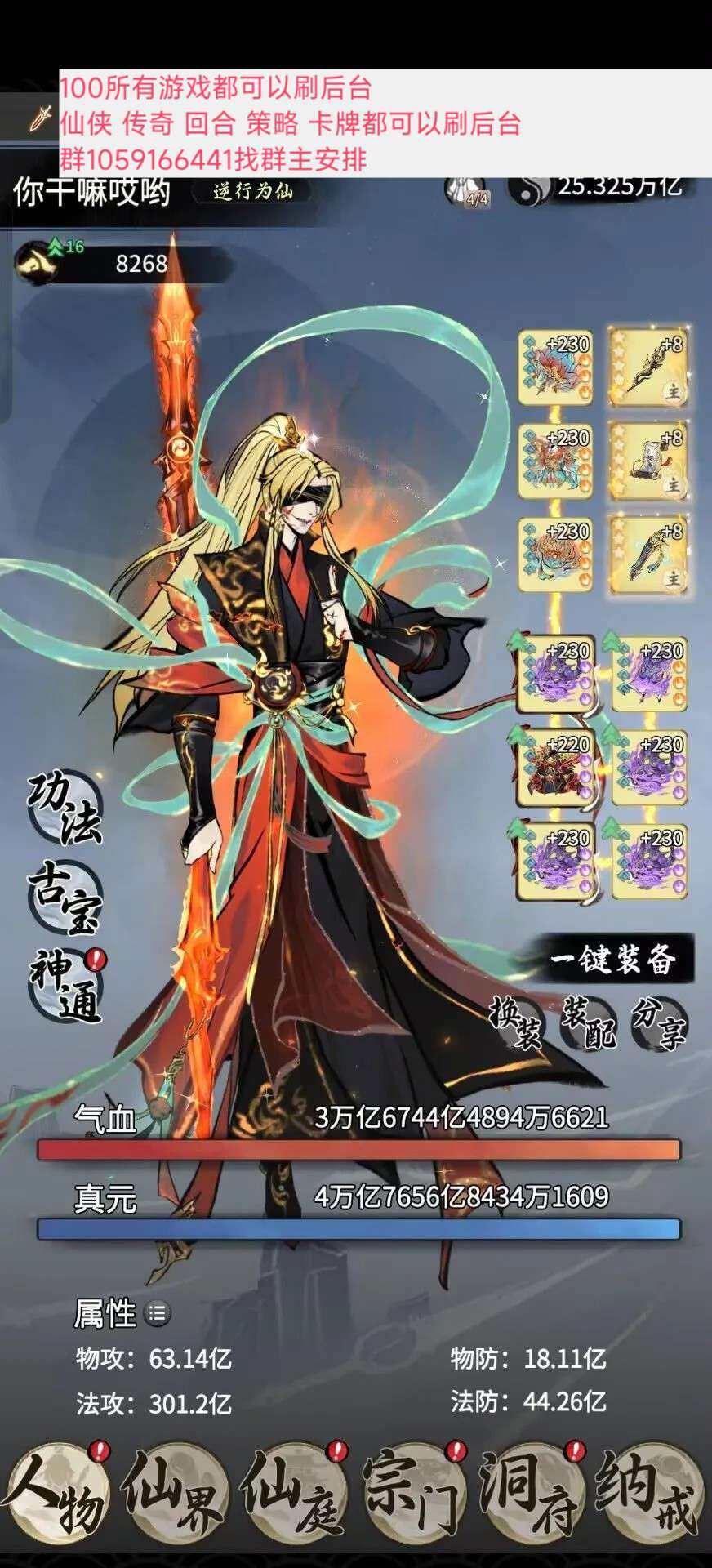 亮点: 该有全有,属性防比区一少6 7万,和另一个人防差不多一样,修为区二,满书,神通氪了1-5星防加1星攻 10万年300防,11万年准圣,爽号,区二 有辅助,屠龙刀的勿扰,懂的来
