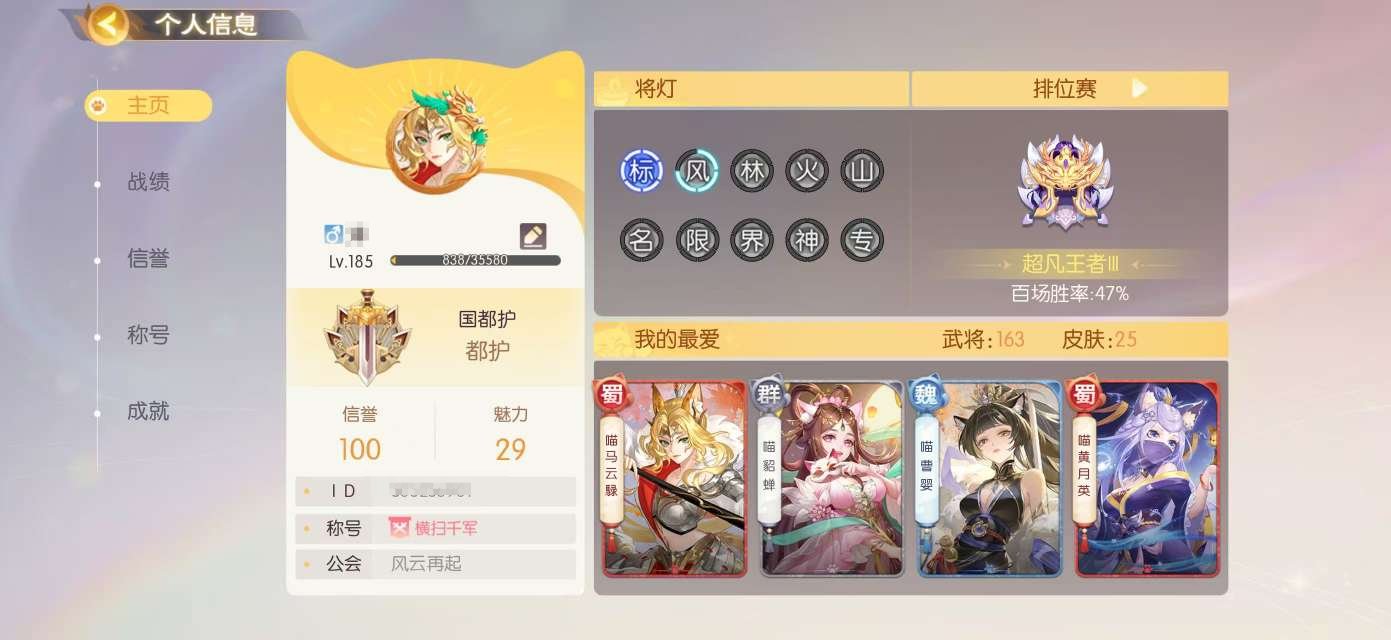 亮点: 大将军第一公会多阴间武将多动态皮肤,家园四个神话8级猫舍11级孵化池13级猫杀榜