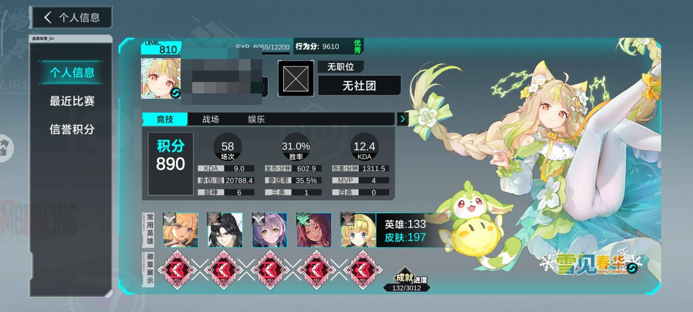 亮点: 有几个熟练度百榜的角色,429皮肤英雄差蕾蒂娜没买(号物资够买只是没想买)。上次买的年卡现在也还没过期,战场榜37,击杀榜90