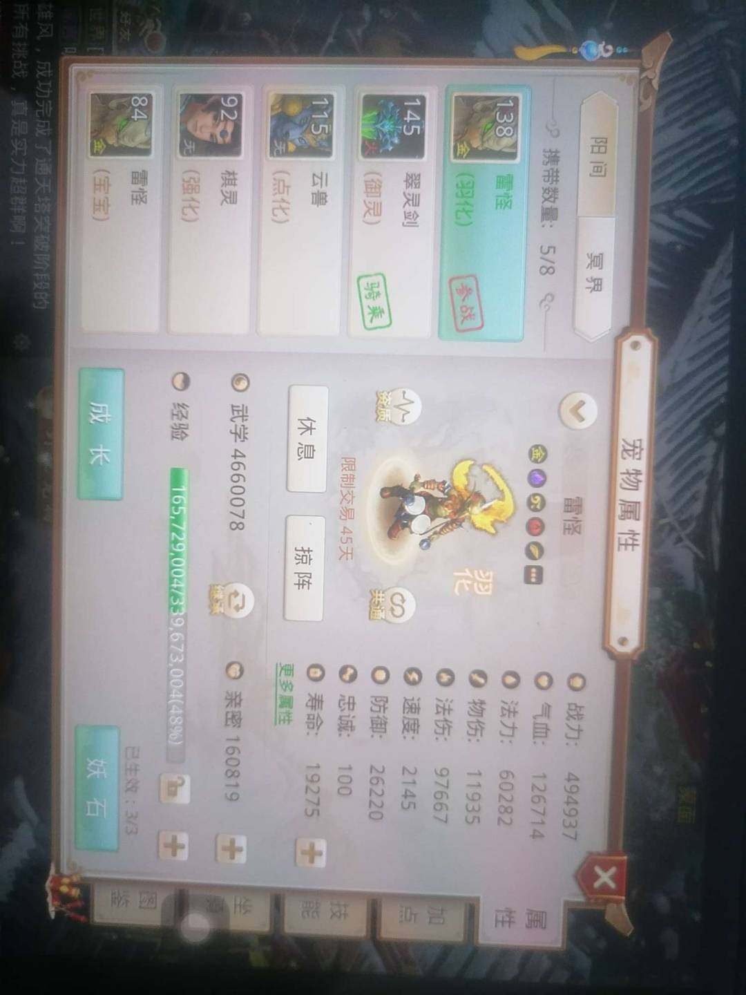 操作系统: 安卓 亮点: 全力水,五阶坐骑,全法宝宝已点化,强化八级