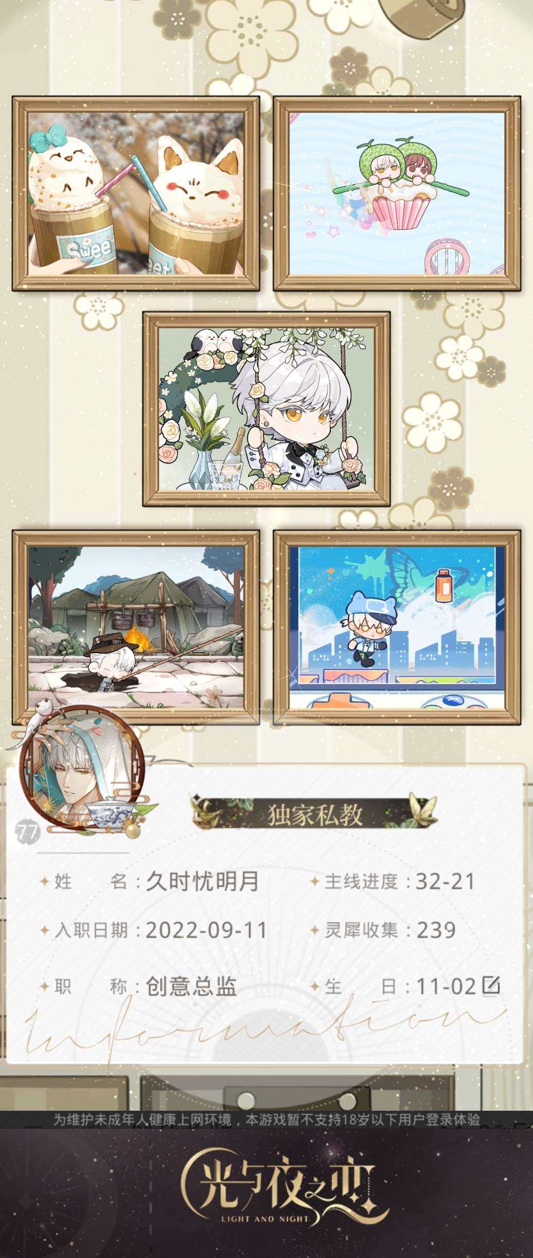 实名: 可修改 六星灵犀: 萧逸·纷乱虹光,萧逸·绚烂之战,陆沉·暮光之境,陆沉·光暖秋林,齐司礼·氤氲,齐司礼·倒影,夏鸣星·绚丽极夜,夏鸣星·遣绻心绪,查理苏·生而有翼,查理苏·缠绵游戏 五星灵犀: 萧逸·无可遁逃,陆沉·弦音似你,查理苏·与你出逃,夏鸣星·旧忆绵长,夏鸣星·幕间诉愿,齐司礼·草莓星球,齐司礼·瑰丽游戏,齐司礼·咫尺,陆沉·一动星光,萧逸·反转霓虹,陆沉·白马童话,陆沉·倾人夜色,萧逸·指间心音,萧逸·碧珀凝光,萧逸·黑色对峙,萧逸·专属造型,查理苏·昼日疑魂 亮点: 六七十张六星 号还挺欧的 玩了将近一千天了 利索出附赠光夜官服周边