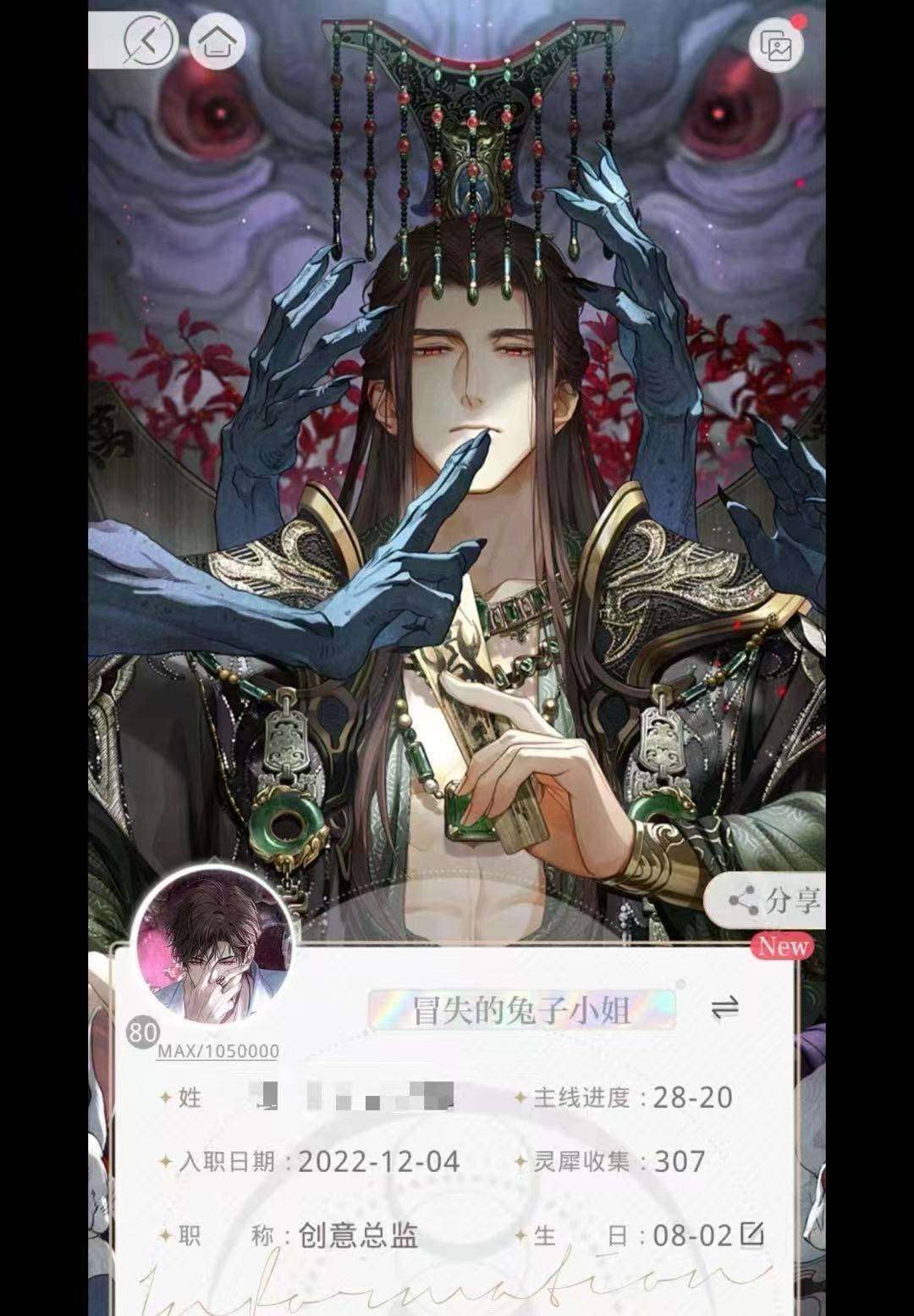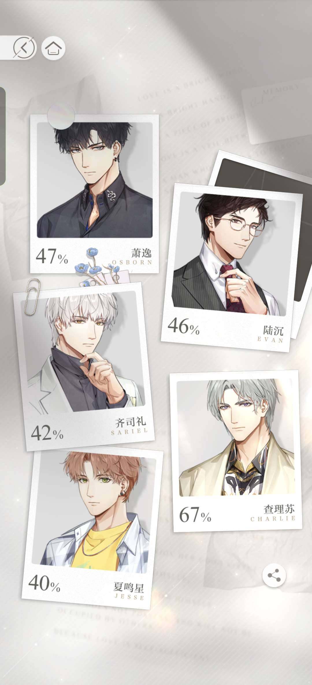 实名: 可修改 六星灵犀: 萧逸·纷乱虹光,陆沉·暮光之境,齐司礼·氤氲,齐司礼·倒影,夏鸣星·遣绻心绪,查理苏·缠绵游戏 五星灵犀: 萧逸·无可遁逃,陆沉·弦音似你,查理苏·与你出逃,夏鸣星·旧忆绵长,夏鸣星·幕间诉愿,齐司礼·草莓星球,齐司礼·瑰丽游戏,齐司礼·咫尺,陆沉·一动星光,萧逸·反转霓虹,陆沉·白马童话,陆沉·倾人夜色,萧逸·指间心音,萧逸·碧珀凝光,萧逸·黑色对峙,萧逸·专属造型,查理苏·昼日疑魂 亮点: 主线全打通 满级卡多 打关毫不费力 齐司礼好感度最高 卡的收集度也较高 其他四位男主好感以及收集度差不多 有2023年情人节卡池除了查理苏以外的四人 有古风卡池全员 氪金条10