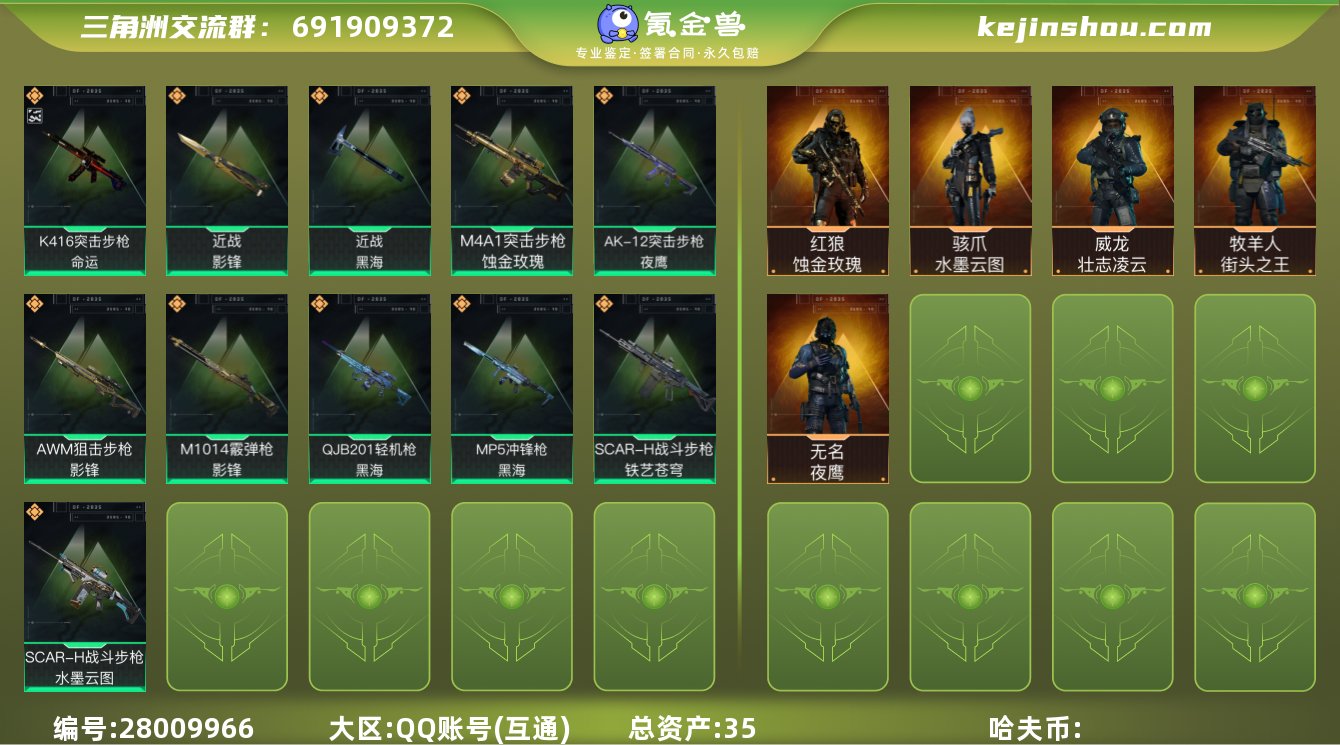 hf6327 总资产35M+饰金玫瑰红狼全套+水墨云图骇爪全套+影峰全套+黑海全套+优品b命运+s2s3s4赛季通行证+烽火等及60 特勤部门等级很高 永久包赔