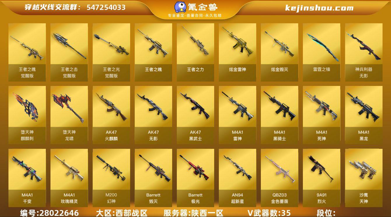 实名: 可修改 排位资格: 有 V武器: AK47-火麒麟,AK47-无影,AK47-黑武士,M4A1-雷神,M4A1-黑骑士,M4A1-死神,M4A1-黑龙,M4A1-千变,M4A1-玫瑰精灵,Barrett-毁灭,Barrett-极光,M200-幻神,AN94-超新星,QBZ03-金色蔷薇,9A91-烈火,沙鹰-天神,屠龙,幻灵之锋,AK47-B-战士,AK47-B-战神,AK-47-猩红传说,唐刀神工天巧,烈火-动感闪耀,天神-动感闪耀,屠龙-动感闪耀,龙啸-堕天神,麒麟刺-堕天神,无影-神兵利器,雷霆之锋 王者武器: 王者之魄,王者之力,王者之光-觉醒版,王者之击-觉醒版,王者之魄-觉醒版 炫金武器: 炫金毁灭,炫金雷神 热门武器: M37-葵 狙击枪稀有皮肤: 毁灭-星空,M200-幻神-周瑜,AWM-天龙-传奇白鲨,毁灭-青帝,毁灭-墨兰 皮肤,毁灭-航天科技皮肤,AWM-裁决-百城联赛天津皮肤 英雄角色: 王者-零-传说之路,鹰,晴雅,职业经理 音效道具: M4A1-雷神音效卡,Barrett-极光音效卡,M4A1-黑骑士音效卡,屠龙动感闪耀音效卡