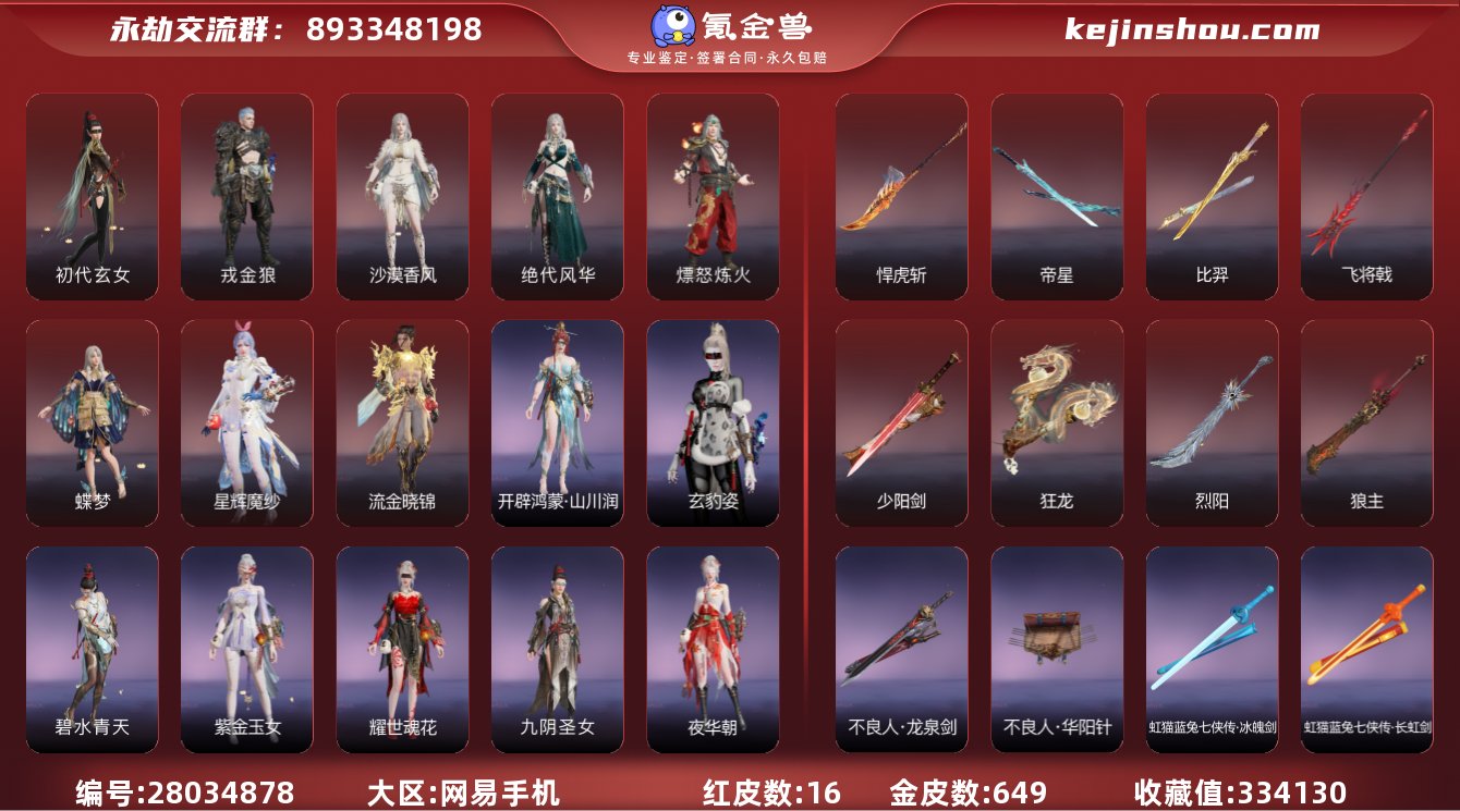 换绑冷却:无冷却 网易支付状态:可注销 收藏值:334130 红皮数:16 黄皮数:649 是否绑定手游账号:未绑定手游 初代玄女,戎金狼,沙漠香风,绝代风华,熛怒炼火,蝶梦,星辉魔纱,流金晓锦 悍虎斩,帝星,比羿,飞将戟,少阳剑,狂龙,烈阳,狼主 卖家说:飞将戟,烈阳,神君印,狂龙 红皮及战旗皮: 绝代风华(迦南皮肤),沙漠香风(迦南皮肤),蝶梦(胡桃皮肤),狼主(阔刀皮肤),烈阳(阔刀皮肤),狂龙(双节棍皮肤),飞将戟(斩马刀皮肤)
