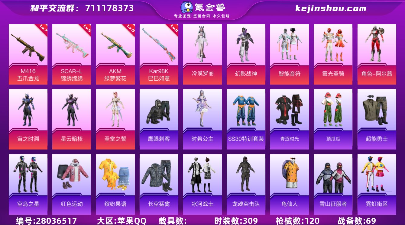 实名: 可修改 时装数: 309 枪械数: 120 战备数: 69 热门装扮: 幻影战神,鹰眼刺客,智能音符,霞光圣骑,阿尔茜,宙之时溯,星云暗核,圣堂之誓,冷漠罗丽 稀有枪皮: M416五爪金龙,AKM绿萝繁花,SCAR-L-锦绣绵绵,Kar98K-巳巳如意