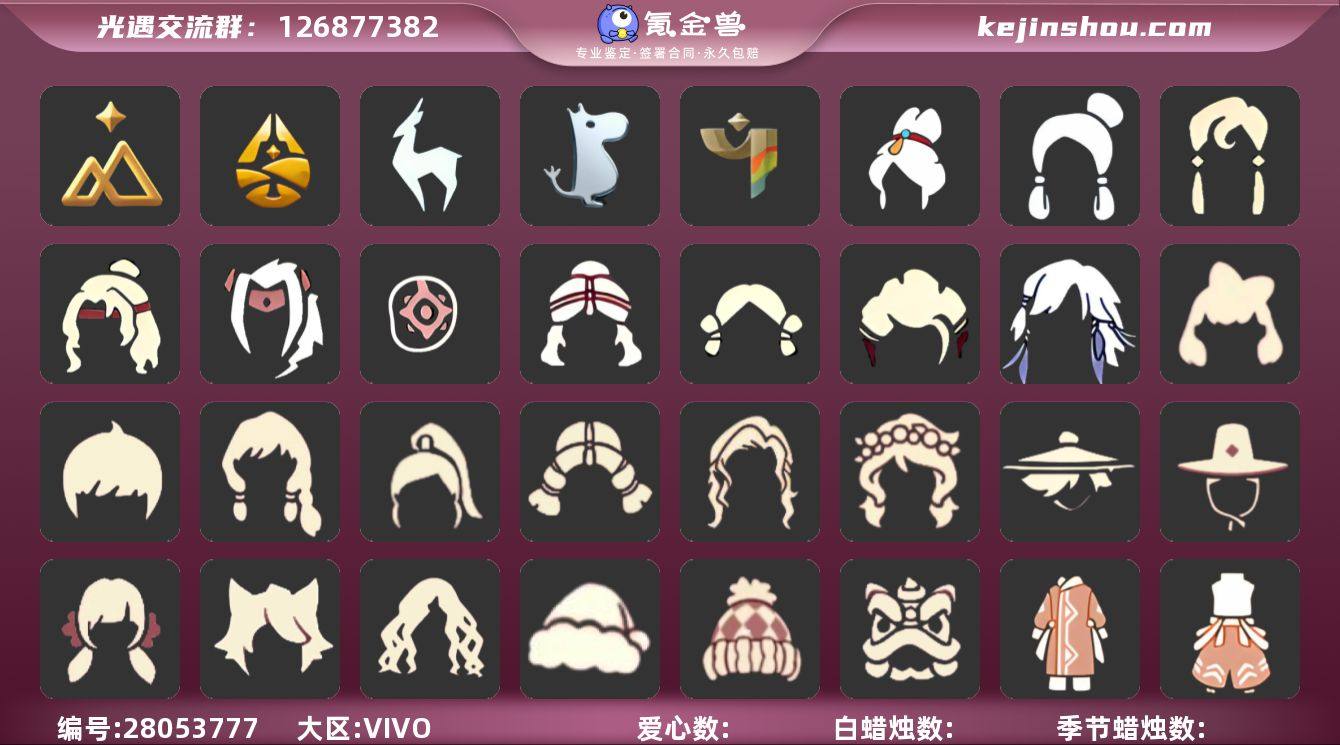 蜡烛数量:300 爱心数量:50 季节蜡烛数量:20 翼数量:200 圣岛季,预言季,梦想季,集结季,小王子季,风行季,潜海季,表演季,迁徙季 迁徙鸟语者斗篷,迁徙引蝶人斗篷,迁徙鳐语者斗篷,迁徙钟匠斗篷,瑞雪斗篷,燕尾斗篷,双色方块斗篷,半边围巾斗篷,遥鲲斗篷,姆明季·斗篷,史力奇斗篷,二级毕业礼斗篷,紫斗篷,黄色蓑衣,围巾斗篷,贵族红绒斗篷,紫色伞纹斗篷,蔚蓝白尾斗篷,紫色毛领斗篷,粉色花瓣斗篷,蝴蝶斗篷,紫金斗篷,老兵斗篷,鲲斗,白鸟斗,黑金,白金,红金,归巢围巾斗,圣诞斗,万圣斗,蓝浴巾 禁阁指甲盖发型,平菇发型,迁徙鳐语者发型,迁徙钟匠发型,雨妈发型,士兵发型,温柔的玩具匠发型,郡主发型,健忘兔子发型,小王子发型,飒爽束发,绿带麻花辫,斜刘海发型,红色包头巾,护目镜发型,双侧绑发,单侧绑发,侠客头,魔法帽,设计师双辫,史力奇发型,歪啾啾发型,光头图腾,公主头,沙滩草帽,红发卡发型,脏辫发型,秃头发型,总裁发型,长发脏辫,归巢毕业发型,女生短发,三束绑发,渔夫马尾圆帽,半边脏辫绑发,白枭,公主,蝴蝶结,正太,书虫,高马尾,粗辫,虚荣,花环,若笠,明制,樱花,猫耳,女巫,卫兵,圣诞帽,锦标赛卷毛 迁徙鸟语者裤子,迁徙水母者裤子,迁徙鳐语者裤子,姆明季·裤子,妮妮裙子,透明裤子,武士裤,白棉裤,搓澡巾,灯笼裤,紧身裤,连体裤,毛靴裤,雪人裤,击剑裤,王子服 鹿角面具,胡子面具,三角额纹面具,右眼泪痕面具,右眼竖纹面具,一字纹面具,凤凰面具,鹌鹑面具,鸟嘴胡子面具,白鸟面具,演员飞吻面具,阿努比斯,红狐狸,黄鼠狼,矮人面具,黑脸,玫瑰花面具 黑框眼镜,蒙眼面巾,麦穗,彩虹耳坠,红耳机 叠叠南瓜,冥龙地毯,谜题笼,谜题箱,蛛网挂饰,青鸟季树杈,心形水晶摆件,蜡烛吊旗,春联铜钱,摆件金钱树,乐器,星星奖杯,贝斯乐器,书架柜子,小棚子,点火坛背饰,坛子,集结季火炬,悬浮吊灯,吊床背饰,牧民琴,遥鲲陶笛,花盆,茶壶,螃蟹背饰,遥鲲玩偶,风铃,水图腾,琵琶,方形烛台,木琴,纸风车,相机,口琴,姆明季帐篷,原木单人床,单人沙发木,光球,玫瑰花,雨伞,笛子,吉他,高音钢琴,排箫,火盆,烟花棒,帐篷,拱门,圣诞椅,万圣椅,雪桶,气球,坐垫,爱心抱枕,七夕挂饰,火炬 樱花头饰,渔夫帽,红色耳机,小红花,明制帽,红色牛角,草帽,羽毛发卡,羽毛装饰,羽毛发饰,行军锅头盔,猫猫头套,花环-头饰,珊瑚,贝雷帽,蓝色音乐会,七夕发饰 迁徙季节项链,欧若拉季节项链,螃蟹肩饰,小王子季节项链,表演季节项链,集结季节项链,风行季节项链,布条斗篷,围巾,风行毛领,海龟项链 毛靴,布鞋 宝骏丹心马尾礼包,绿茸茸卷耳发饰礼包,紫框眼镜礼包,云音伴游耳机,冬日围巾斗篷,献瑞折扇礼包,小狗周年发饰,园丁装扮,史力奇帽子,史力奇套装,姆明饰品套装,蝙蝠套,巫师,围巾,星球斗,小狐狸,绊爱,大铁头,蜘蛛斗,肯德基联动,茶桌,茶壶,餐桌,白绒金,瑞雪,绒帽,橘子,贝壳,黄伞,兔子,南瓜,枯角,tgc,彩虹耳钉,魔法棒,雪人鞋,创始人 卖家说:除了没有魔法耳坠找不到缺点,价格好谈