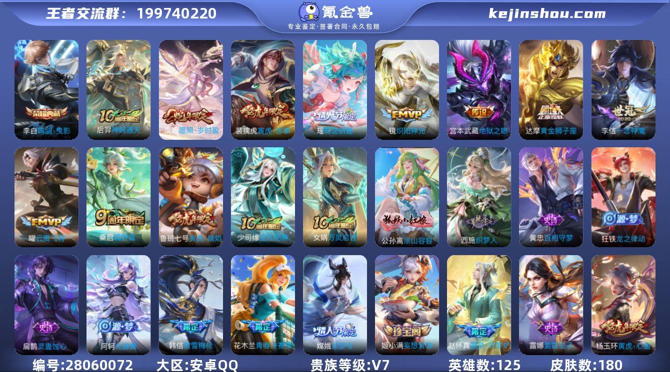 贵族等级:V7 典藏皮肤数:1 珍品无双皮肤数:0 无双皮肤数:0 珍品传说皮肤数:0 传说皮肤数:11 史诗皮肤数:66 皮肤数:180 英雄数:125 段位:绝世王者 卖家说:不可二次