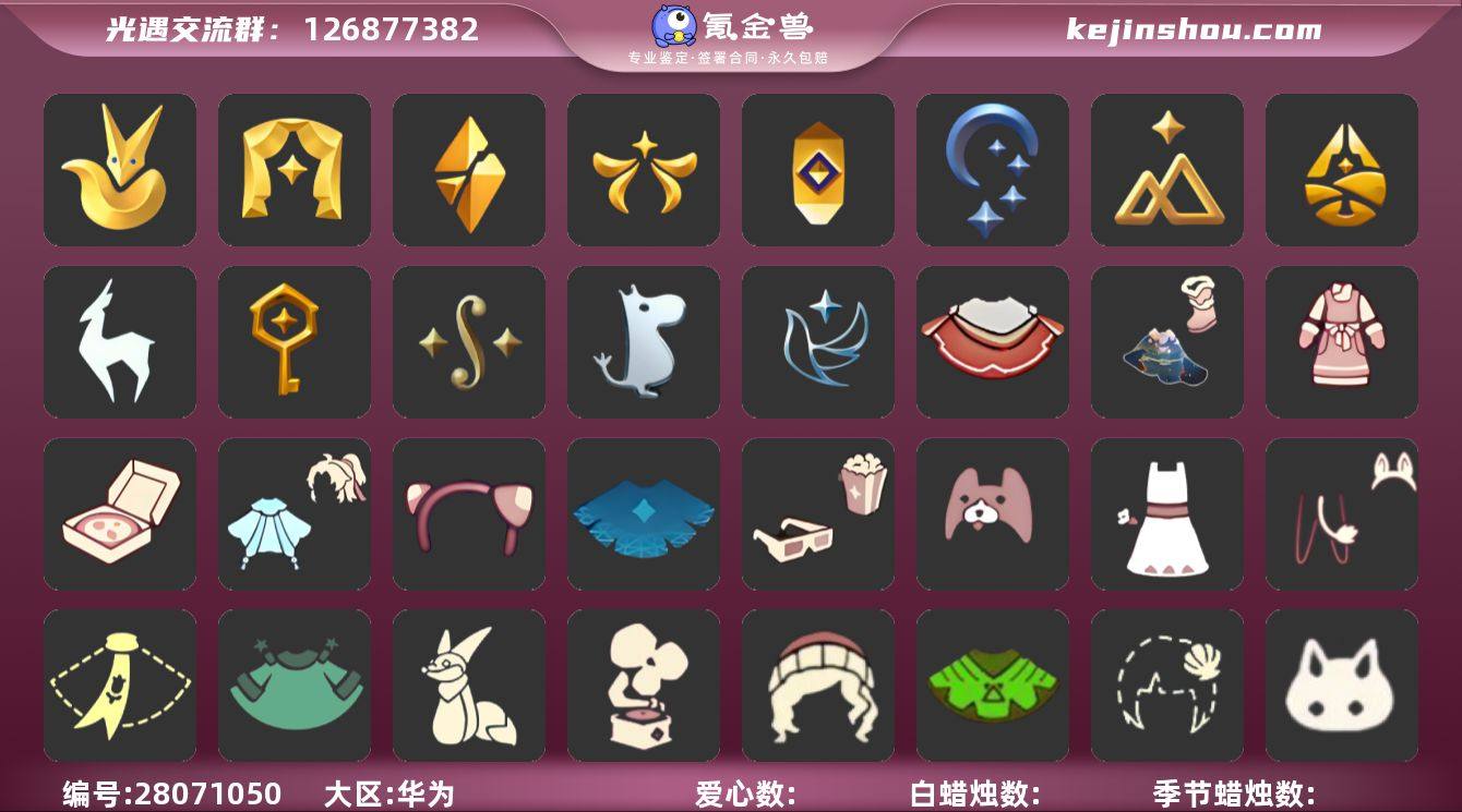 账号类型: 手机账号 季节已毕业: 小王子季,表演季,破晓季,欧若拉季,夜行季,追忆季,拾光季,归巢季,九色鹿季,筑巢季,二重奏季,姆明季,青鸟季 完成地图: 晨岛,云野,雨林,霞谷,暮土,禁阁,全图毕业 珍稀物品: 白枭,透明蝶翼斗,玫瑰花 礼包: 围巾,星球斗,小狐狸,音乐桌,彩虹帽,粽叶,贝壳,兔子,彩虹耳钉,彩虹耳机,奥利奥,四叶草,暗彩装扮,创始人,彩虹泡泡机,姆明饰品套装,向日葵连衣裙,小狗周年发饰,潮汐套装礼包,粽子发饰礼包,必胜客联动装扮礼包,必胜客联动分享披萨背饰礼包,青衫落拓礼包,周年影院套餐礼包,线框斗篷礼包,缤纷飘带斗篷礼包 裤子: 武士裤,白棉裤,搓澡巾 面具: 黄鼠狼,红狐狸 面饰: 红耳机 项链: 围巾 发型: 蝴蝶结,正太,樱花,公主头,虚荣,猫耳 头饰: 花环 斗篷: 白金,红金,白鸟斗,花瓣斗篷 配饰: 雨伞,高音钢琴,吉他,笛子,大铃铛乐器,乐器 亮点: 有青鸟季季卡