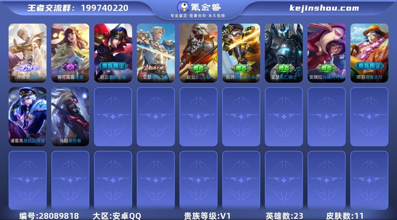 实名: 可修改 性别: 男号 贵族等级: V1 英雄数: 23 皮肤数: 11 无双皮: 无相