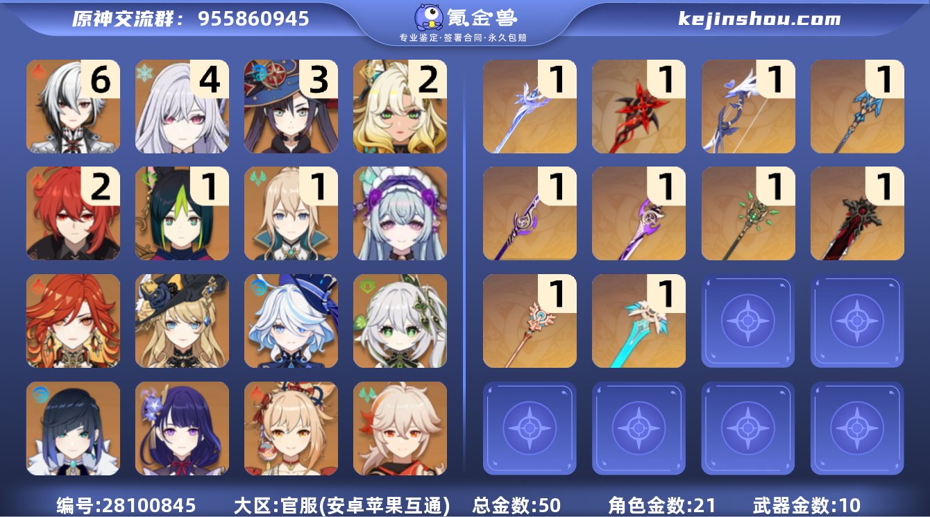 邮箱是否赠送:不送 邮箱:字母Q邮 总黄数:50 男/女主:女主 6命阿蕾奇诺,4命丝柯克,3命莫娜,2命希诺宁,2命迪卢克,1命提纳里,1命琴,0命梦见月瑞希,0命玛薇卡,0命娜维娅,0命芙宁娜,0命纳西妲,0命夜兰,0命雷电将军,0命宵宫,0命枫原万叶,0命甘雨,0命钟离,0命迪希雅,0命刻晴,0命七七 精1苍耀,精1赤月之形,精1若水,精1息灾,精1薙草之稻光,精1雾切之回光,精1和璞鸢,精1狼的末路,精1天空之脊,精1天空之刃 冒险等级:60 卖家说:号很欧,安全可靠,可以包赔