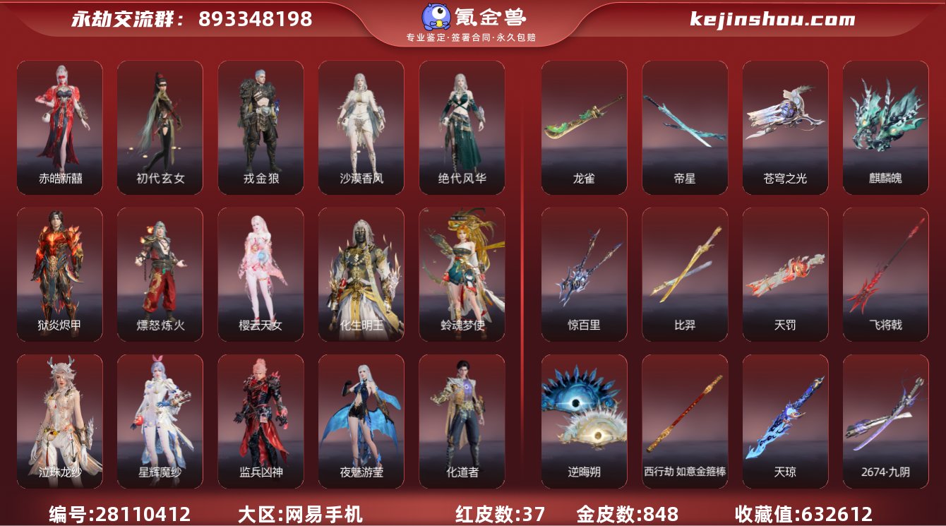 换绑冷却:无冷却 网易支付状态:未注册 收藏值:632612 红皮数:37 黄皮数:848 是否绑定手游账号:已绑定手游 赤皓新囍,初代玄女,戎金狼,沙漠香风,绝代风华,狱炎烬甲,熛怒炼火,樱云天女,化生明王,蛉魂梦使,泣珠龙纱,星辉魔纱,监兵凶神,夜魅游莹,化道者,执明神君,流金晓锦,画中仙 龙雀,帝星,苍穹之光,麒麟魄,惊百里,比羿,天罚,飞将戟,逆晦朔,天琼,西行劫·如意金箍棒,2674·九阴,少阳剑,涯角,狂龙,烈阳,狼主,毕方