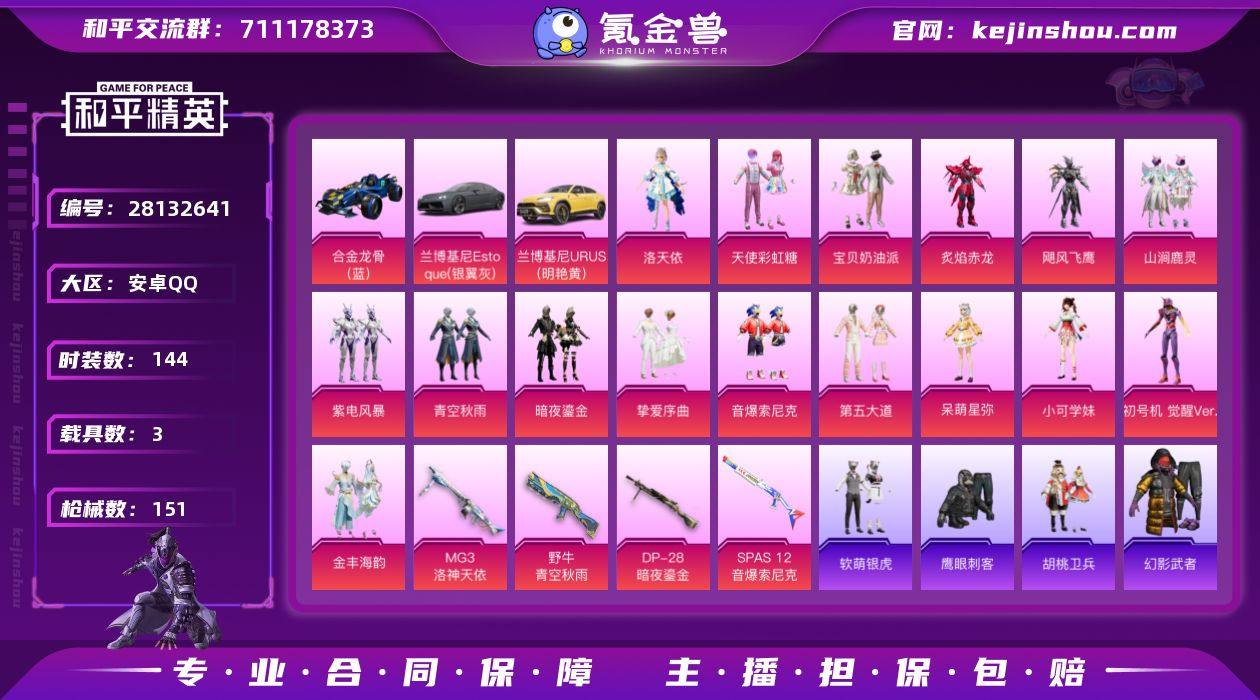 衣服素材号 可改实名【觉醒紫螳螂 梦幻火箭 粉螳螂 蓝螳螂】 3车 4特效枪 17粉装 144套装 151枪械 6王牌印记 55836热力值 洛天依 天使彩虹糖 金丰海韵 初号机 呆萌星弥 小可学妹 第五大道 紫电风暴 飓风飞鹰 炙焰赤龙 挚爱序曲 山涧鹿灵 宝贝奶油 音爆索尼克 梦幻火箭 暗夜鎏金 清空秋雨 蓝螳螂 粉螳螂 漫步者合金龙骨 兰博基尼URUS(明艳黄) 4级MG3-洛神天依 4级野牛-青空秋雨 5级DP-28-暗夜鎏金 4级SPAS-12-音爆索尼克 N1296 和平精英买号永久包赔带二次营地ID:932920342