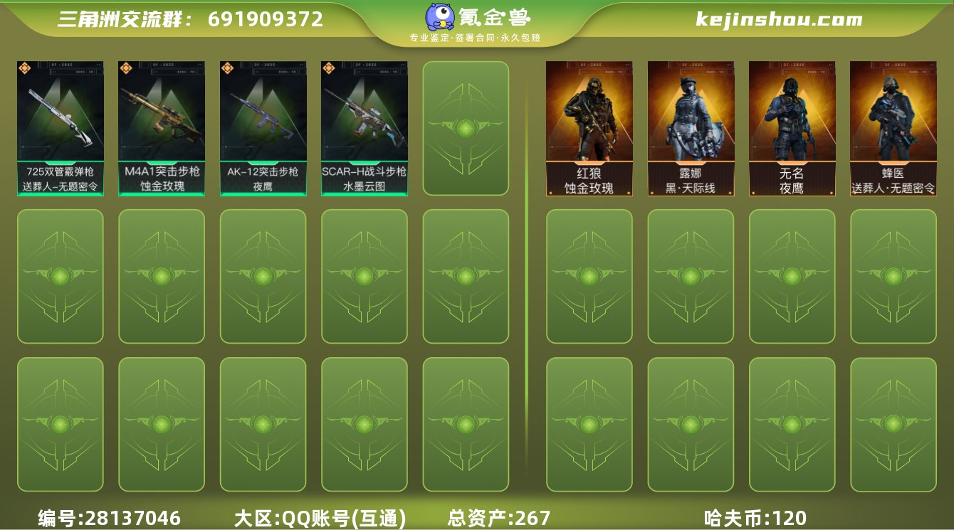 hf6760 总资产267m+纯币120m+饰金玫瑰红狼全套+水墨云图骇爪全套+黑天际线全套+s4s5赛季通行证+烽火等及60 特勤等及高 永久包赔