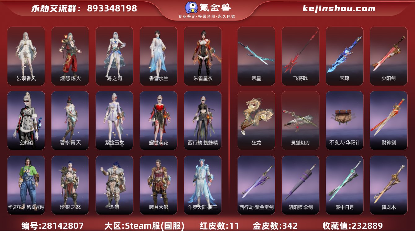 红皮数:11 黄皮数:342 收藏值:232889 幻丝数:711 等级:410 三排段位:黄金 通行证:未升级 沙漠香风,熛怒炼火,海之奇,香雪水兰,朱雀星衣 帝星,飞将戟,天琼,少阳剑,狂龙,灵狐幻刃 卖家说:有个自选红