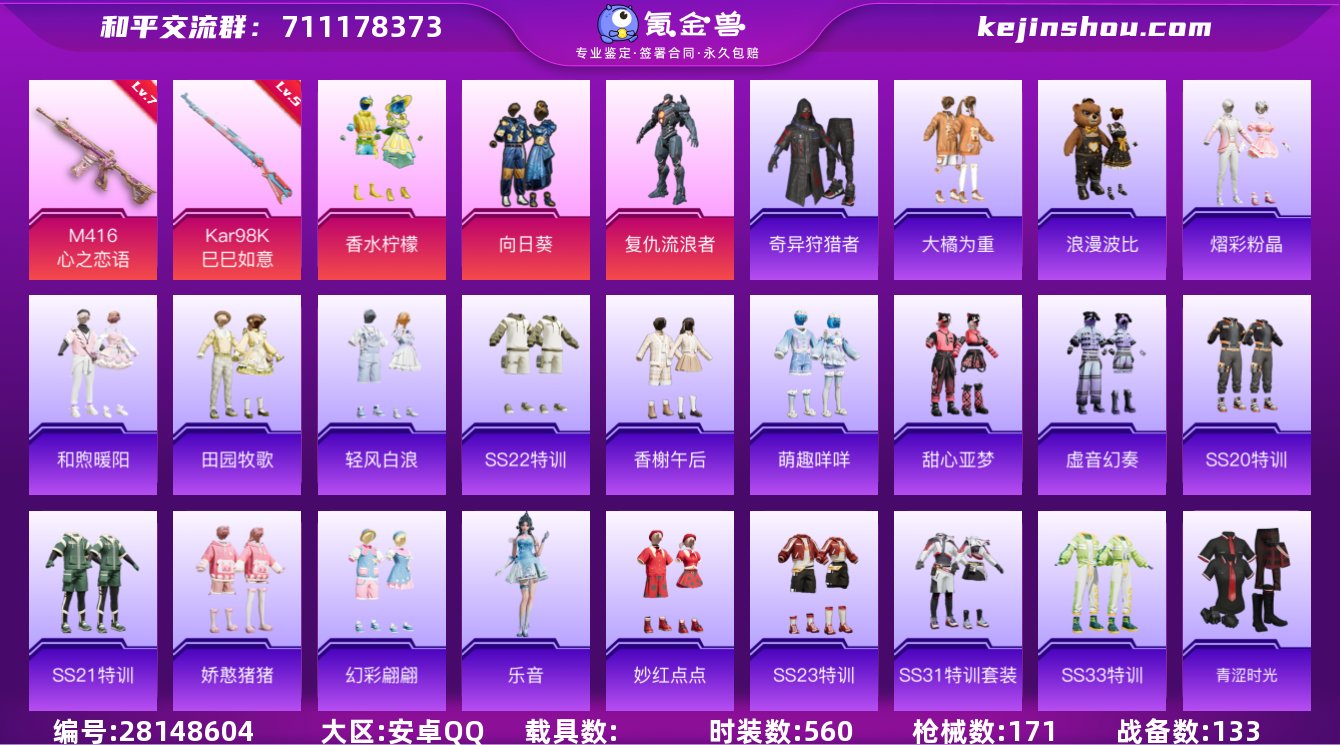 3粉装 2升级枪 9印记 实名: 可修改 时装数: 560 枪械数: 171 战备数: 133 热门装扮: 奇异狩猎者,浪漫波比,向日葵,香水柠檬,复仇流浪者,大橘为重 稀有枪皮: M416心之恋语,Kar98K-巳巳如意