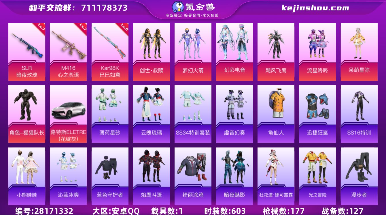 实名:不可修改 时装数:603 载具数:1 枪械数:177 战备数:127 创世·救赎,呆萌星弥,幻彩电音,飓风飞鹰,流星咚咚,梦幻火箭,猩猩队长 路特斯ELETRE(花绽灰) 七级M416-心之恋语,七级SLR-暗夜玫瑰,五级Kar98K-巳巳如意