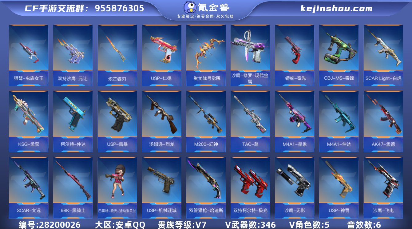 可二次实名 【可排位-可转区-钱包已删】安卓QQ-贵7-346v-收藏278武器-404万化-11王者【/王者之影/王者之魂/王者之业-冰霜奇迹/王者之兽/王者之掣/王者之狱/王者之蝶/王者之兽手雷/王者之影闪光弹-拉丝皮/王者之影烟雾弹/王者之翼烟雾弹-拉丝皮/】【/仲达套/M200-幻神/M4A1-仲达/AK47-孟德/M4A1-星象/SCAR-文远/TAC-慈/98K-星神/烈龙/CBJ-MS-毒蜂/KSG-孟获/墨刃-幻神/虎头湛金枪/】【柯尔特-仲达/USP-雷暴/USP--仁德/USP-神罚/USP-机械迷城/QSZ92-冰魂觉醒MK23-机械纪元/双持沙鹰-元让/蟒蛇-奉先/沙鹰-修罗-不屈老兵/沙鹰-修罗-现代金属/沙鹰-飞电/沙鹰-无影-暗月/蚩尤战弓觉醒/猎弩-虫族女王/烈焰弓/双管猎枪-哈迪斯/柯尔特-伏刹山海觉醒/双持柯尔特-极光/黄金风之子/】【/乔月/樱/幽灵刀锋-觉醒/职场灵狐-赛事经理/关小雨/】【/巴雷特-毁灭-现代战场/AK47-火麒麟-电音/MK47-鼓龙-嘴炮/M4A1-仲达-原汁原味/AK47-无影-电音/M4A1-雷神-电音/灭音效-斩杀/消灭音效-能量核心/消灭音效-诸神黄昏/消灭音效-8bit/98K-星神-漫游之线/狙击枪线-旋螺烟雾/最终消灭-太白诗仙/消灭图标-蚩尤/消灭图标-VIP/消灭图标-封神榜/】详情看图★星迈游★低价出售找回包赔