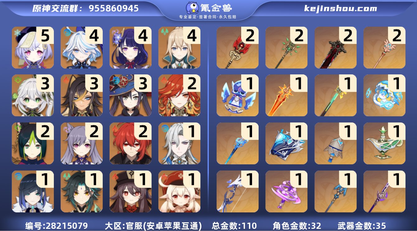 原神开服号 诚信卖 等级60 黄数110,号上还有8000多万金币,3000多本大经验书五星角色基本大毕业水神4+1,雷神4+1,草神3+1,火神2+1,胡桃1+2,那维莱特1+1,夜兰1+1,神子0+1,万叶0+1,希诺宁0+1等等