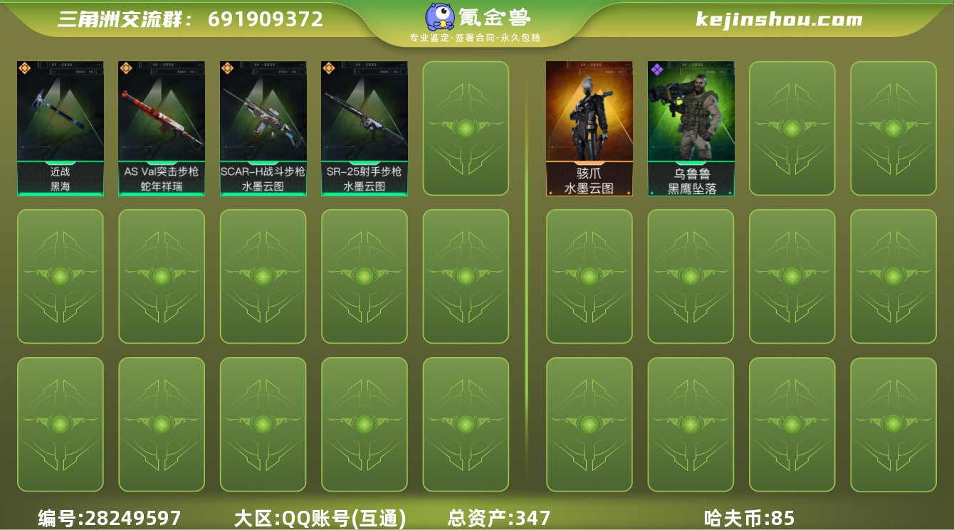 hf7091总资产347m+纯币85m+s53x3赛季安全箱+水墨云图骇爪全套+黑海刀+s4赛季通行证+烽火等级60+特勤部门等级很高+守信不俞+永久包赔