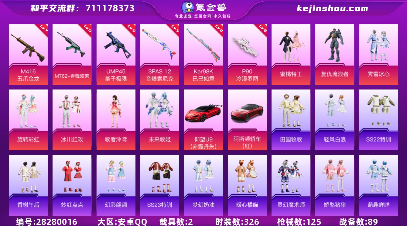 7粉装 6特效枪 2载具 实名: 可修改 时装数: 326 载具数: 2 枪械数: 125 战备数: 89 热门装扮: 蜜桃特工,复仇流浪者,霁雪冰心,旋转彩虹,冰川红玫,歌者泠鸢,未来歌姬 载具: 阿斯顿·马丁DBS(红),仰望U9(赤霞丹朱) 稀有枪皮: M416五爪金龙,SPAS-12音爆索尼克,UMP45量子极限,M762-青锋波束,Kar98K-巳巳如意,P90-冷漠罗丽