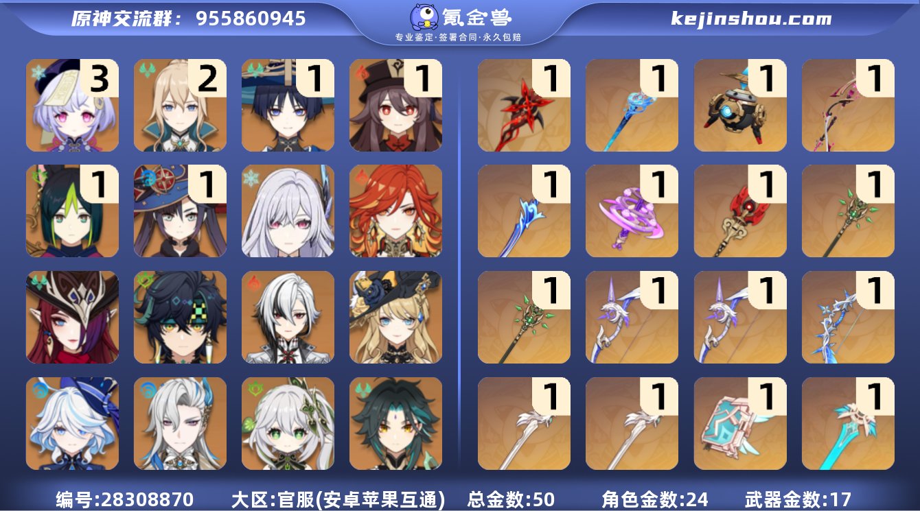 成品号出售,诚心出,玩了差不多三年了,实在不想肝了,有想要的朋友可以买下来玩玩,里面有三十三个五星角色,十七个五星武器,还有迪卢克和胡桃的皮肤,强度中规中矩,圣遗物大多毕业,深渊十二层凹一凹可以满,幻想真境基本每期都可以满,地图探索度不高,后备隐藏能源充足