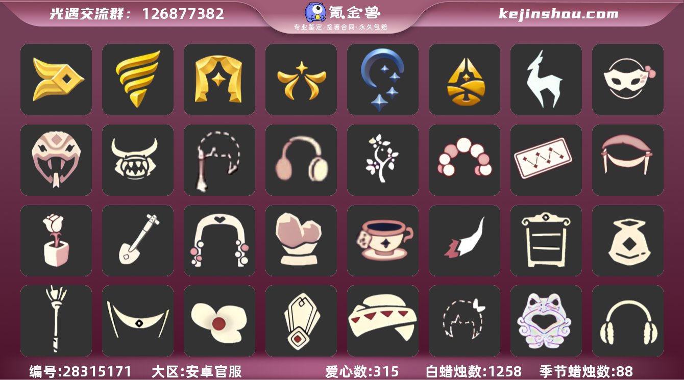 蜡烛数量:1258 爱心数量:315 季节蜡烛数量:88 翼数量:208 风行季,潜海季,表演季,欧若拉季,夜行季,归巢季,九色鹿季 彩染围巾斗篷,彩染跳跃舞者斗篷 玫瑰面具,蛇年面具,牛头面具 彩虹耳坠,红耳机 蓝色星星地毯,气球拱门,树枝,粽叶吊床,玫瑰小盆栽,寻宝铲,繁花拱门,心形水晶摆件,泡浴茶杯,冥龙号角,书架柜子,点火坛背饰,集结季火炬,吊床背饰 樱花头饰,古代发饰,采药人帽,蝴蝶发饰,国王面具,红色耳机,红色牛角 夜行季绒毛围脖,欧若拉季节项链,九色鹿季节项链,表演季节项链,风行季节项链,风行毛领,海螺项链,海龟项链,圣诞领结,海浪围巾 寻宝长靴,凉鞋,长筒凉鞋 彩虹武士裤 卖家说:这个号玩了快四年啦,活动该有的都有噢,二级斗也全部有噢,好多的都有噢有点记不清啦