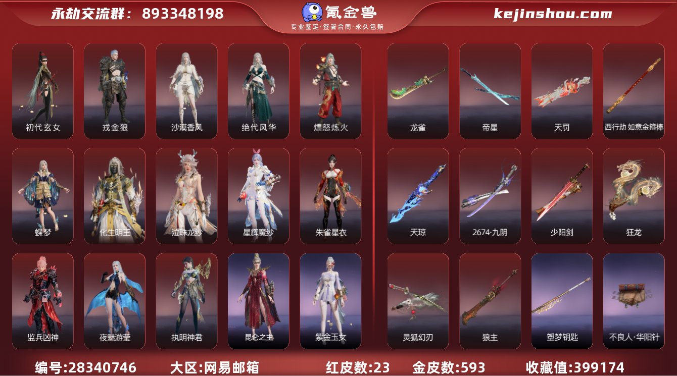 换绑冷却:无冷却 网易支付状态:可注销 收藏值:399174 红皮数:23 黄皮数:593 是否绑定手游账号:已绑定手游 初代玄女,戎金狼,沙漠香风,绝代风华,熛怒炼火,蝶梦,化生明王,泣珠龙纱,星辉魔纱,朱雀星衣,监兵凶神,夜魅游莹,执明神君 龙雀,帝星,天罚,天琼,西行劫·如意金箍棒,2674·九阴,少阳剑,狂龙,灵狐幻刃,狼主