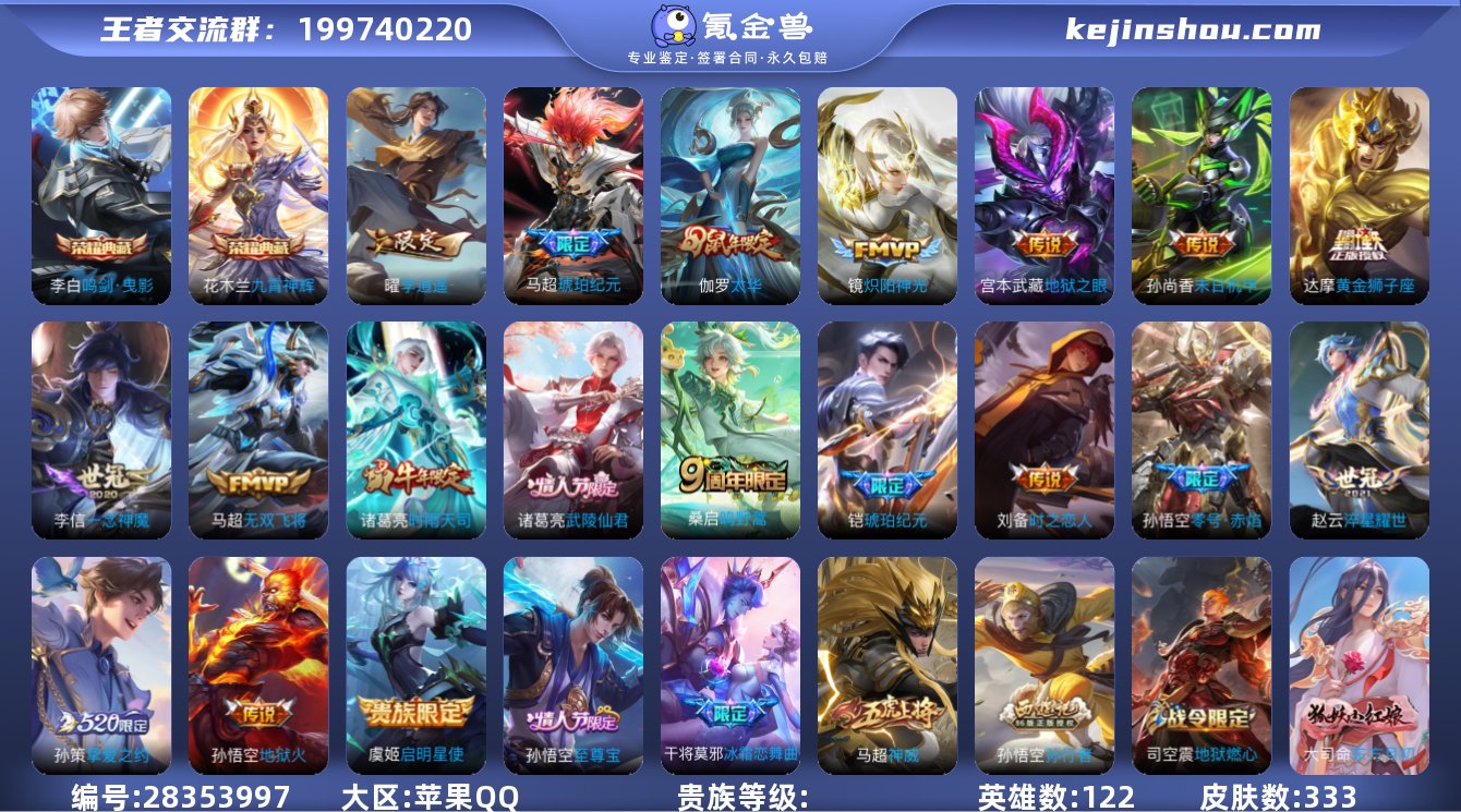金标宫本武藏-蒙恬 打野34段 实名: 可修改 英雄数: 122 皮肤数: 333 荣耀水晶: 鸣剑·曳影,九霄神辉 传说皮: 黄金狮子座,炽阳神光,一念神魔,末日机甲-孙尚香,地狱火,零号·赤焰,地狱之眼,李逍遥,时之恋人-刘备,淬星耀世,挚爱之约,无双飞将,琥珀纪元铠,琥珀纪元马超 限定皮: 冰锋战神,遇见飞天,李小龙,梁祝,云端筑梦师,时雨天司,魔法小厨娘,天狼溯光者,神威,蜜橘之夏,太华,青春决赛季,冰霜恋舞曲,逐梦之星,逐梦之影,瑞麟志,朱雀志,至尊宝,一生所爱,武陵仙君,如梦令-后羿,大圣娶亲,高山流水,孙行者,猪悟能,傲雪梅枪,百木心枪,玉兔公主,五谷丰年,山海·玄木吟,鸣野蒿