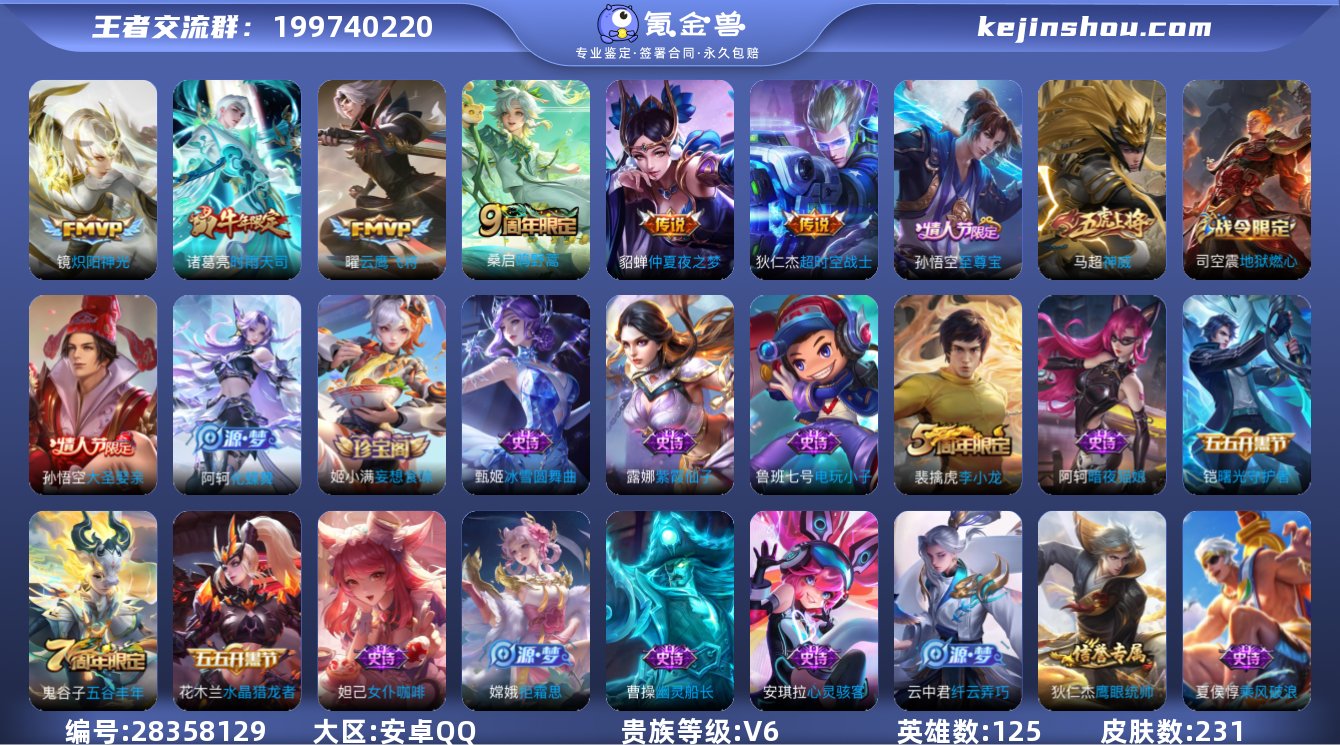 三千多星币 实名: 可修改 贵族等级: V6 英雄数: 125 皮肤数: 231 传说皮: 云鹰飞将,炽阳神光,仲夏夜之梦,超时空战士-狄仁杰 限定皮: 李小龙,游园惊梦,梁祝,时雨天司,神威,至尊宝,大圣娶亲,高山流水,五谷丰年,鸣野蒿