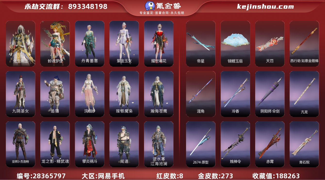 换绑冷却:无冷却 网易支付状态:可注销 收藏值:188263 红皮数:8 黄皮数:273 是否绑定手游账号:未绑定手游 化生明王,蛉魂梦使 帝星,锦鲤玉扇,天罚,西行劫·如意金箍棒,涯角 卖家说:冲冠精武值得入手