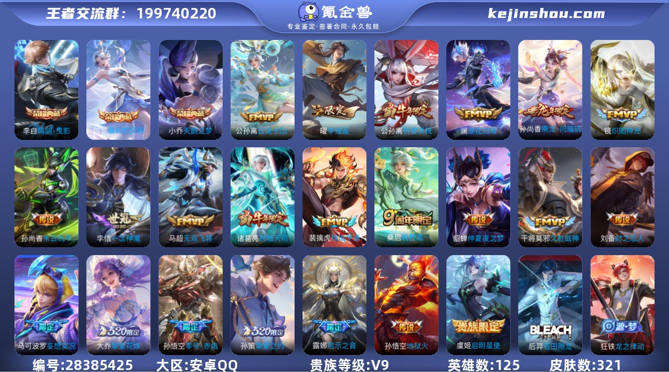 中路36段 发育路31段 连体和平号 两粉装 两升级枪 五万热力值 实名: 不可修改 贵族等级: V9 英雄数: 125 皮肤数: 321 荣耀水晶: 天鹅之梦,鸣剑·曳影,最初的交响 传说皮: 久胜战神,炽阳神光,一念神魔,末日机甲-孙尚香,地狱火,仲夏夜之梦,零号·赤焰,李逍遥,时之恋人-刘备,挚爱之约,挚爱花嫁,无双飞将,妄想实况,澜逐花归海,乘龙·问璇玑,祥瑞亨通,云诺千山 限定皮: 遇见飞天,李小龙,祈雪灵祝,游园惊梦,时雨天司,白晶晶,奇迹圣诞,天狼运算者,凤凰于飞,霸王别姬-虞姬,高山流水,匿光追影者,启示之音,五谷丰年,山海·玄木吟,鸣野蒿