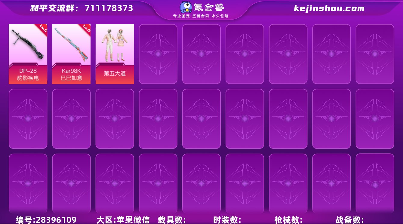 yvx2287 苹果微信 可二次 1粉装2特效枪24套装45枪皮 第五大道 Kar98K-巳巳如意(5级) DP-28-豹影疾电(5级) 和平精英账号