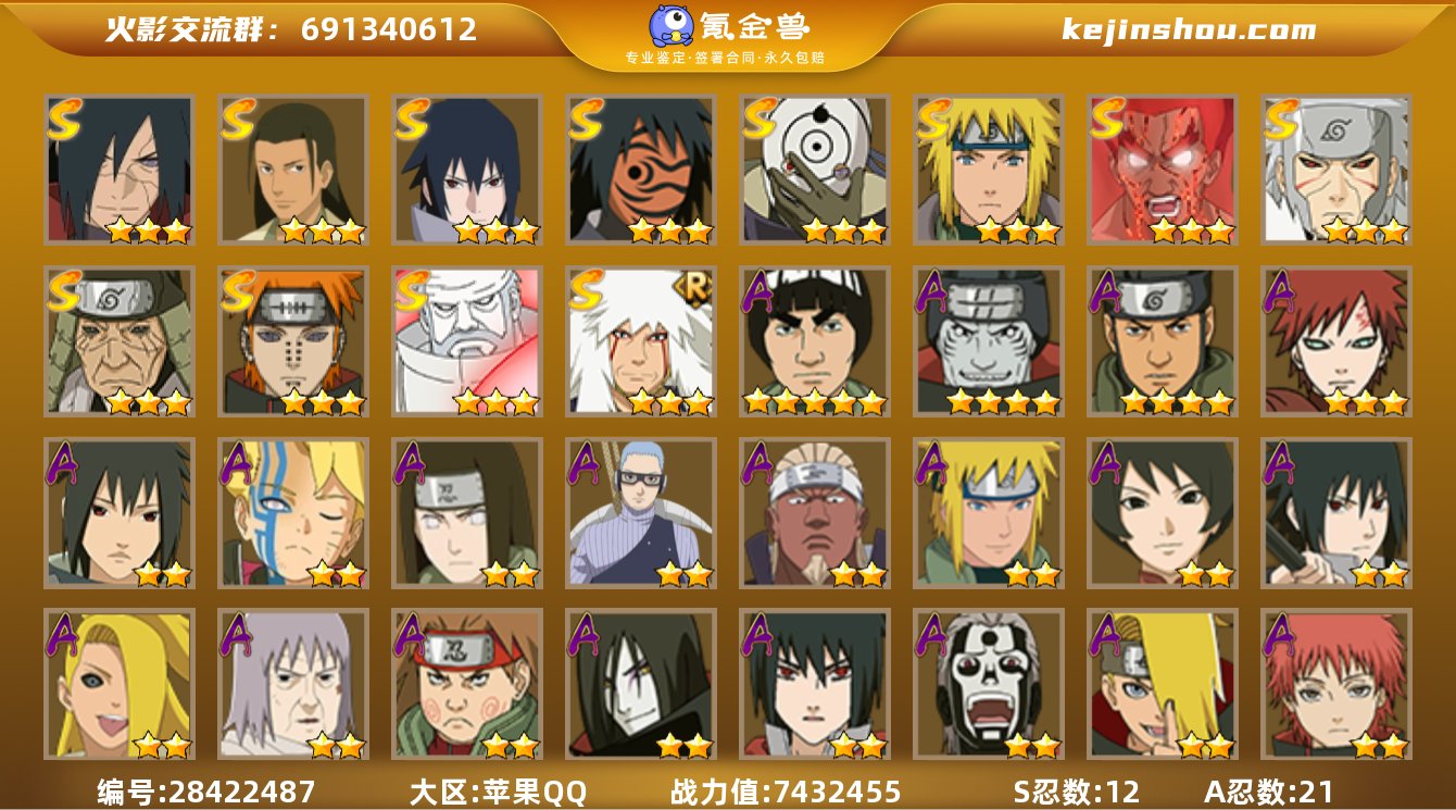实名:可修改 贵族等级:V13 战力值:7432455 S忍数:12 A忍数:21 三星宇智波斑「秽土转生·解」,三星千手柱间·木叶创立,三星宇智波佐助「永恒万花筒」,三星神秘面具男「红夜之刃」,三星宇智波斑「白面具」,三星波风水门,三星迈特凯「死门」,三星千手扉间「秽土转生」,三星猿飞日斩「秽土转生」,三星佩恩「天道」,三星大筒木金式「博人传」,三星自来也「舞之豪杰」 五星迈特凯,四星干柿鬼鲛,四星猿飞阿斯玛,三星我爱罗「疾风传」,二星宇智波泉奈,二星漩涡博人「桃式显现」,二星日向宁次·忍界大战,二星长十郎「六代目水影」,二星艾「青年」,二星波风水门「青年」,二星黑土「博人传」,二星宇智波佐助「须佐能乎」,二星迪达拉「秽土转生」,二星千代「近松十人卫」,二星秋道丁次「忍界大战」,二星大蛇丸「晓」,二星宇智波佐助「万花筒写轮眼」,二星飞段「死司凭血」,二星迪达拉,二星蝎,二星宇智波鼬