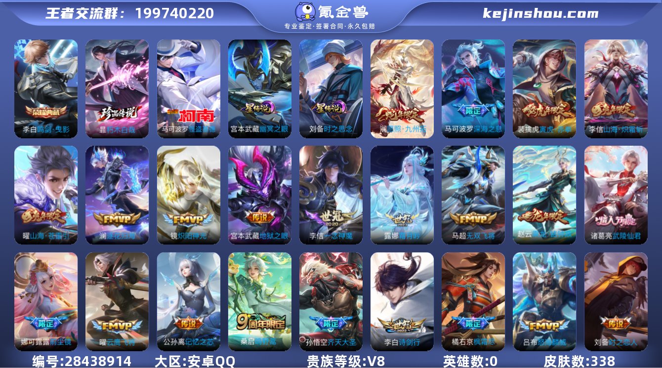 实名:可修改 英雄数:0 皮肤数:338 珍品无双皮肤数:2 典藏皮肤数:1 无双皮肤数:0 珍品传说皮肤数:2 传说皮肤数:28 史诗皮肤数:88 朽木白哉,怪盗基德 段位:荣耀王者