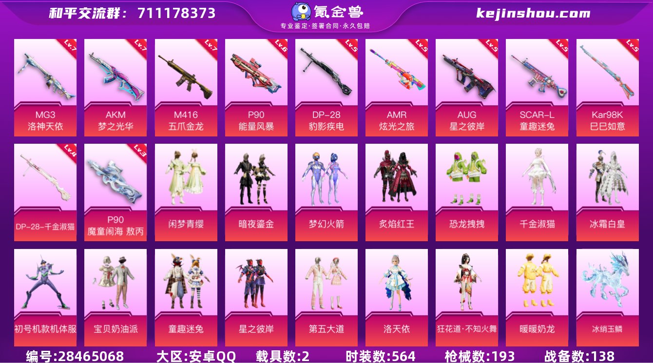 实名:可修改 时装数:564 载具数:2 枪械数:193 战备数:138 暗夜鎏金,宝贝奶油派,冰霜白皇,初号机款机体服,炙焰红王,第五大道,狂花道·不知火舞,恐龙拽拽,洛天依,梦幻火箭,暖暖奶龙,千金淑猫,童趣迷兔,闲梦青缨,星之彼岸 冰绡玉鳞,保时捷918Spyder(液态银) 七级AKM-梦之光华,七级M416-五爪金龙,七级MG3-洛神天依,六级P90-能量风暴,五级DP-28-豹影疾电,五级AMR-炫光之旅,五级AUG-星之彼岸,五级Kar98K-巳巳如意,五级SCAR-L-童趣迷兔,四级DP-28-千金淑猫,三级P90-魔童闹海 敖丙 卖家说:可二次可小刀女友生病了螳螂洛天依第五大道千金淑猫稀有粉装都有新出的马和p90九级枪也有保时捷的轿跑也有赛季豪华手册已开绝世王牌已上还有一千五百多点券红装碎片三百个特权卡一年300以上心悦特权还有二十天定榜882探险家有排面连体王者v9马上v10荣耀典藏有六个有武则天韩信李白孙尚香鲁班全息碎影 至尊宝梅西白晶晶深海之息武陵仙君天魔缭乱高品质传说都有买到绝不亏