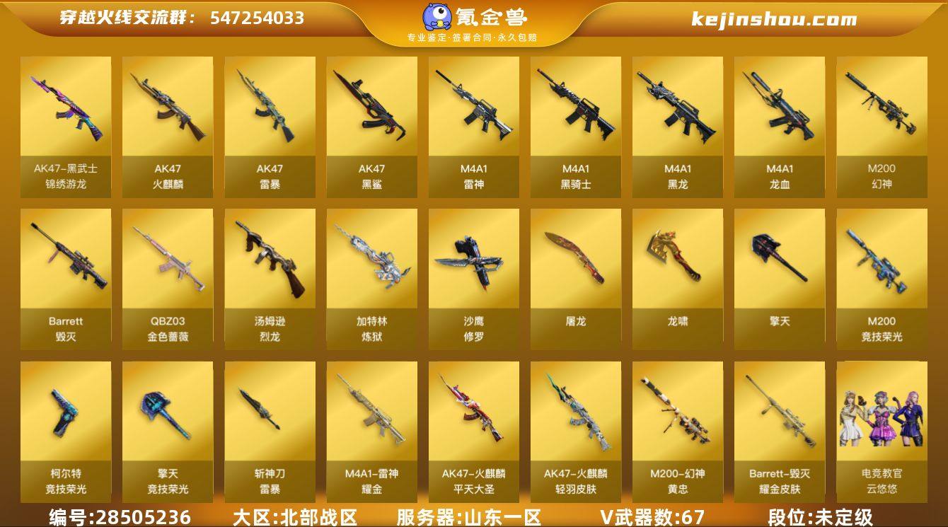 山东一区-71V-1王者-0炫金 【热门武器】:QBZ03-金色蔷薇,M200-幻神,M200-竞技荣光*2,M4A1-黑骑士,汤姆逊-烈龙*6,加特林-炼狱,斯泰尔-蝴蝶,COP-白鲨,USP-雷暴,沙鹰-修罗*4 【音效卡】:擎天-云海游龙音效卡,M4A1-黑骑士音效卡,Barrett-毁灭音效卡 【稀有皮肤】:M200-幻神-黄忠皮肤,雷神-荣耀之魄,雷神-耀金皮肤,火麒麟-轻羽皮肤,火麒麟-平天大圣,毁灭耀金皮肤 【角色】:零-水下丽影,电竞教官-云悠悠,春,蜀雪,迷迭香,铁骑荣耀,职业选手,战地猎狐 【人偶武器】:COP-白鲨,斯泰尔-蝴蝶,AWM-灵狐-15周年嘉年华,迷你深渊冰龙 【暴走生化】:斯泰尔-蝴蝶,超级对讲机 【挑战大师】:激光毁灭者III,冰龙粉碎者-白马银枪 【英雄级武器】:M200-竞技荣光*2,柯尔特-竞技荣光,擎天-竞技荣光,高爆手雷-竞技荣光*2,烟雾弹-竞技荣光,闪光弹-竞技荣光,AK47-雷暴,USP-雷暴,斩神刀-雷暴,QBZ03-金色蔷薇,M4A1-雷神,M4A1-黑龙,M4A1-黑骑士,加特林-炼狱,汤姆逊-烈龙*6,AK47-火麒麟,Barrett-毁灭,M4A1-龙血*3,M200-幻神,AK47-黑鲨,黑武士-锦绣游龙,沙鹰-修罗*4,擎天*2,龙啸*4,屠龙*4 【特殊枪械】:蝴蝶斯泰尔+6烈龙,0白虎,1黑骑士,6烈龙,0盘龙,1炼狱,1蝴蝶斯泰尔