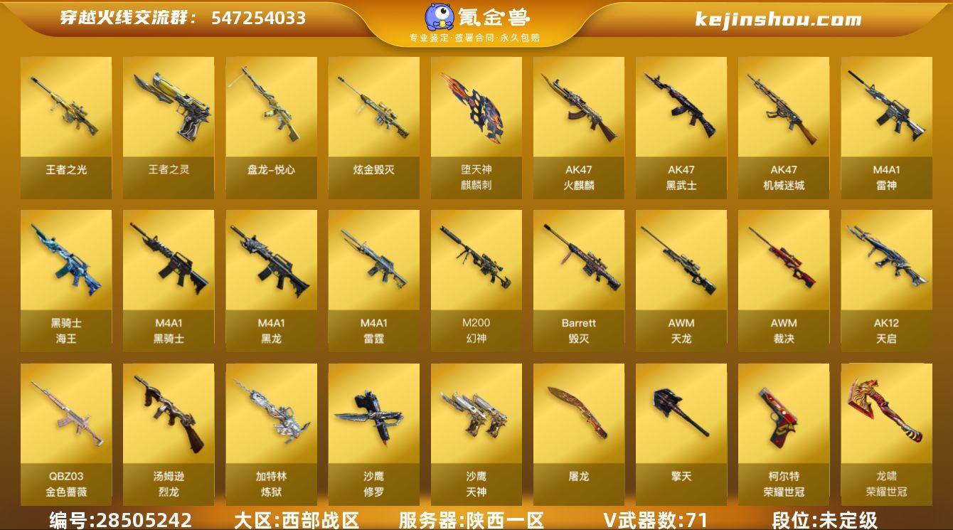 陕西一区-74V-8王者-1炫金 【热门武器】:QBZ03-金色蔷薇,M200-幻神,死亡之眼,荣耀世冠-火麒麟,荣耀世冠-雷神,荣耀世冠-柯尔特,M4A1-黑骑士*4,汤姆逊-烈龙*3,加特林-炼狱,羊驼玩偶,沙鹰-修罗*3,荣耀世冠-龙啸 【王者炫金武器】:炫金毁灭,盘龙-悦心,王者之光,王者之灵 【音效卡】:M4A1-黑骑士音效卡,Barrett-毁灭音效卡 【稀有皮肤】:幻神-冠军之幻,雷神-能量核心,雷神-荣耀之魄,火麒麟-冠军之心,AK47-火麒麟-传奇EVEN,黑骑士-摸金校尉,毁灭-暗月,毁灭-冠军之怒,毁灭-黑大圣皮肤,天龙-秘银,天龙-能量核心,AWM-天龙-传奇70KG,AWM-天龙-传奇白鲨,AWM-CFS 2020,屠龙-荣耀之锋 【角色】:王者玲珑,炫,蜀雪,迷迭香,审判者,雅典娜,铁骑荣耀,职业选手 【人偶武器】:迷你深渊冰龙,夺魂,深渊终结者手雷,闪光弹-小乔 【暴走生化】:死亡之眼 【挑战大师】:神圣爆裂者-末日III,AK47-冰龙粉碎者 【英雄级武器】:麒麟刺-堕天神,M4A1-雷霆,荣耀世冠-火麒麟,荣耀世冠-雷神,荣耀世冠-柯尔特,荣耀世冠-龙啸,QBZ03-金色蔷薇,M4A1-雷神*2,M4A1-黑龙,M4A1-黑骑士*4,加特林-炼狱,汤姆逊-烈龙*3,AK47-火麒麟,AK47-黑武士,AK12-天启,AWM-天龙*3,Barrett-毁灭,AWM-裁决*2,AK47-机械迷城,M200-幻神,黑骑士-海王,AK-47-猩红传说*2,AK47-B-战神,沙鹰-天神,沙鹰-修罗*3,擎天,屠龙*5 【特殊枪械】:0白虎,4黑骑士,3烈龙,0盘龙,1炼狱,0蝴蝶斯泰尔