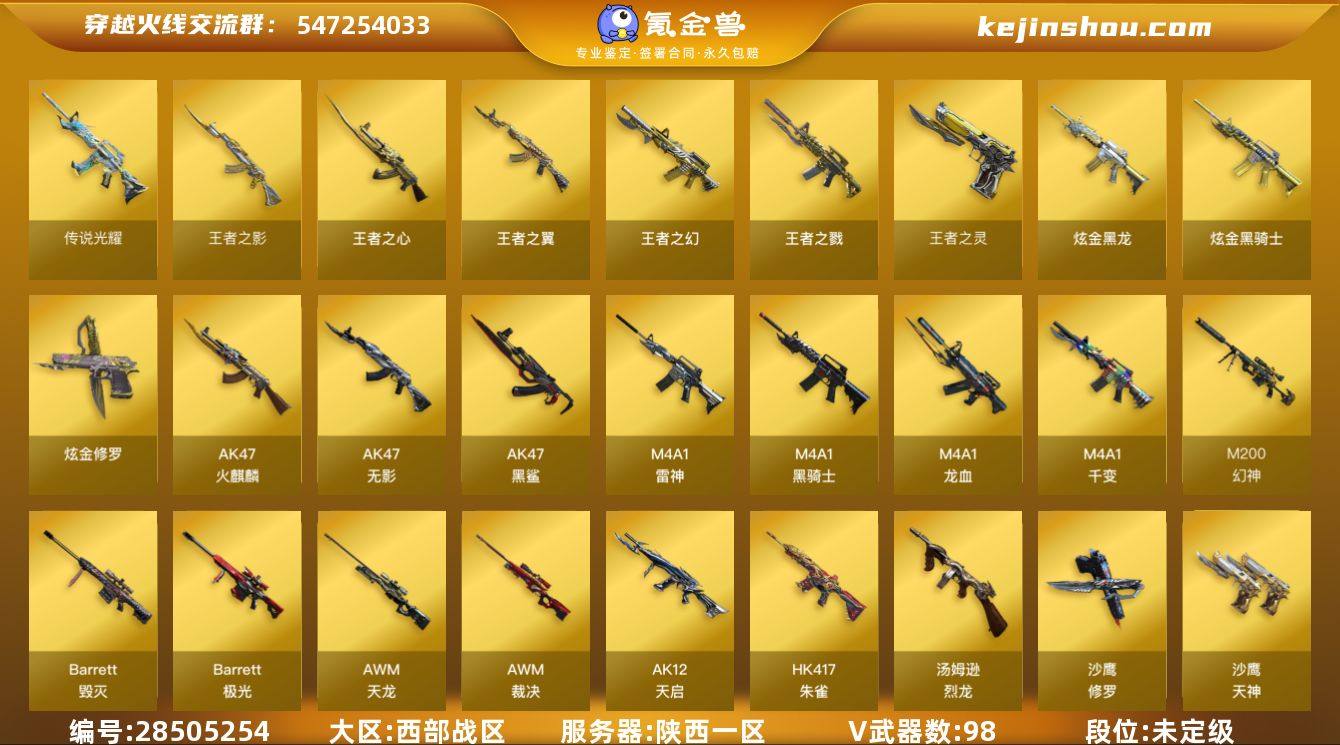 陕西一区-101V-11王者-7炫金 【传说武器】:传说光耀 【热门武器】:传说光耀,HK417-朱雀*2,M200-幻神,M200-竞技荣光,死亡之眼,M4A1-黑骑士*2,汤姆逊-烈龙*6,裁决-雪莉杨,USP-雷暴,沙鹰-修罗*7 【王者炫金武器】:炫金骑士*4,炫金黑龙,炫金修罗*2,王者之戮,王者之幻,王者之翼,王者之影,王者之心,王者之灵 【音效卡】:AK47-火麒麟音效卡,M4A1-雷神音效卡,M4A1-黑龙音效卡,M4A1-黑骑士音效卡,Barrett-毁灭音效卡,Barrett-极光音效卡 【稀有皮肤】:雷神-星空*2,火麒麟-冠军之心,黑骑士-摸金校尉,M4A1-黑龙-361,毁灭耀金皮肤,毁灭-星空,无影-霓裳皮肤,修罗-星空,龙啸-冠军之啸 【角色】:电竞教官-云悠悠,魅影,迷迭香 【人偶武器】:裁决-雪莉杨 【暴走生化】:死亡之眼 【英雄级武器】:M200-竞技荣光,柯尔特-竞技荣光,擎天-竞技荣光,高爆手雷-竞技荣光*7,烟雾弹-竞技荣光*7,闪光弹-竞技荣光*7,破空枪刃-夜魔*2,马来剑-夜魔,USP-雷暴,HK417-朱雀*2,M4A1-雷神*2,M4A1-黑骑士*2,汤姆逊-烈龙*6,AK47-无影*2,AK47-火麒麟*3,AK12-天启,AWM-天龙*4,Barrett-毁灭*2,Barrett-极光,AWM-裁决,M4A1-龙血,M200-幻神,AK47-黑鲨*2,M4A1-千变*2,沙鹰-天神*2,沙鹰-修罗*7,麒麟刺,擎天,龙啸,屠龙*3 【特殊枪械】:0白虎,2黑骑士,6烈龙,0盘龙,0炼狱,0蝴蝶斯泰尔